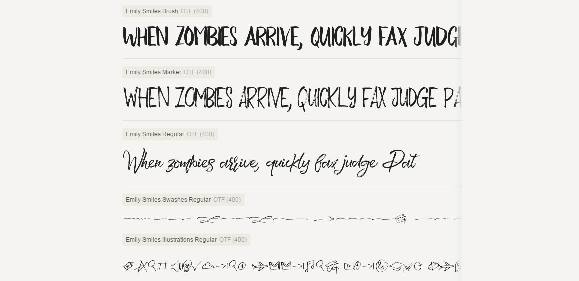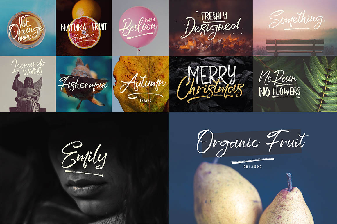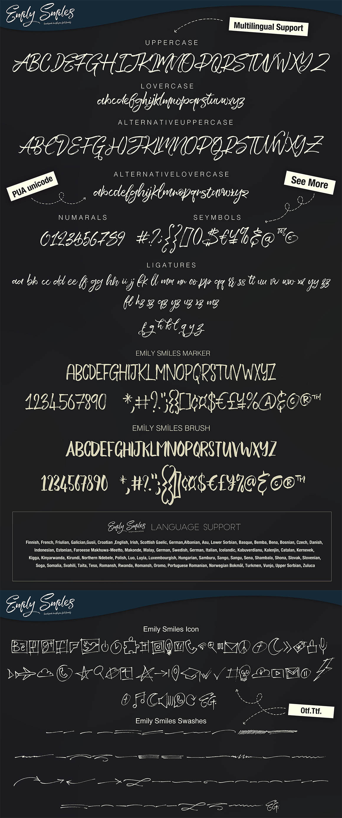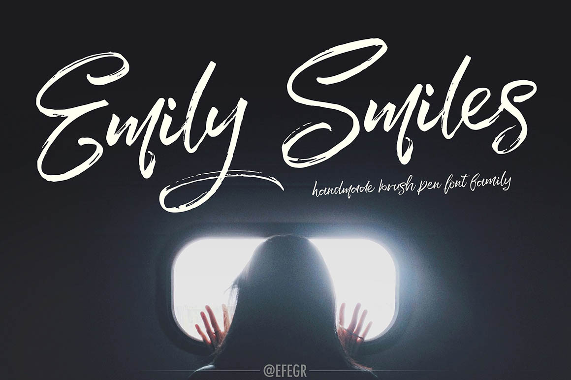 Brush font family with stable character structure and new shape designs. Emily Smiles new stable character structure; It is ideal for exhibiting a solid position for products such as brand, poster design, book covers, magazines, fashion campaigns, album covers, logo, slogan, typography. Emily smiles from ‘a’ to ‘z’ ” aa ” has adjacent ligatures letters and a little more. For example, in the photoshop and illustrator, the same letters are combined and the new design letter comes together. It gives a natural image. In addition to standard characters, there are alternative upp