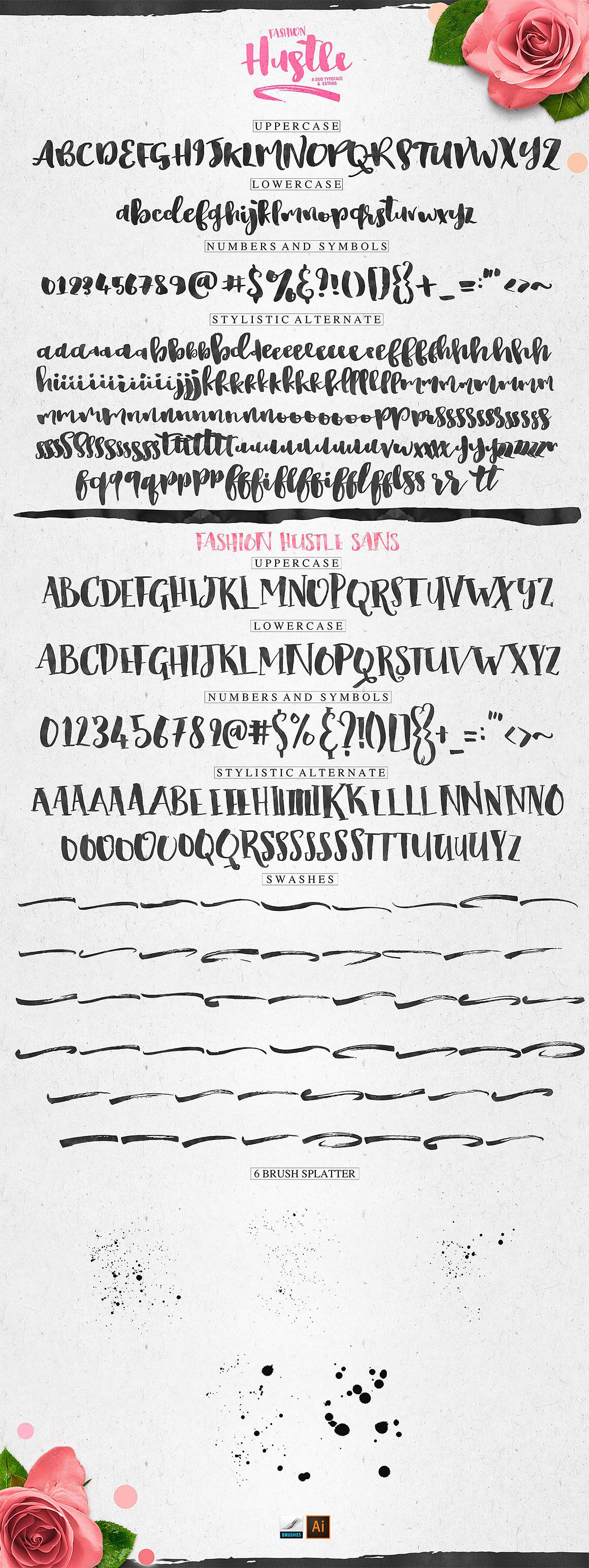 Fashion Hustle, Bold font and brush next to a long fine-quoted comes with 2 elegant font. Bold script fonts comes with stylistic 160 lowercase letters! Fashion Hustle sans comes with capital letters and lowercase letters which have different formats and 55 stylistic extreme character. 35 units swashes bonus comes with the file. OTf and a format. 6 Brush splatter, and is given as a bonus to your artistic floor design in photoshop brush format! 120 handmade doodle illustration for your typographic designs. Comes with a stabilizing cozy atmosphere to help to reinforce the visual message 🙂 21 units designed them with a realistic air Hustle photoshop style is a gift for your added bonus. 15 with one pattern file, photoshop style, png, and is given as a JPEG.