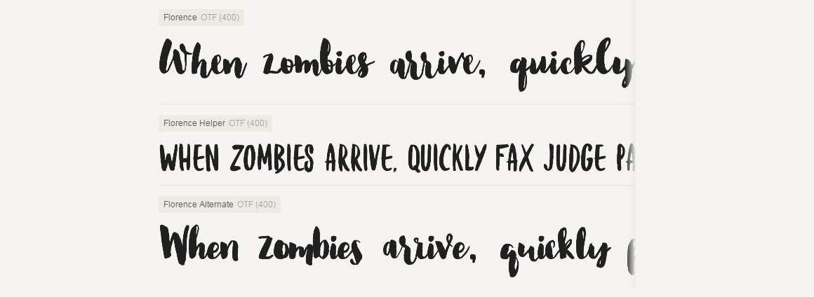 Florence is an OTF & TTF hand-lettering typeface with a delicious brush style, it’s perfect for letterhead, apparel design, headline, logotype, poster, card, and etc. Florence comes with two font styles; Florence regular & Florence helper. Alternates are accessible by turning ‘Stylistic Alternates’ and ‘Ligatures’ buttons on in Photoshop’s Character panel, or via any software with a glyphs panel, e.g. Adobe Illustrator, Photoshop, Inkscape.