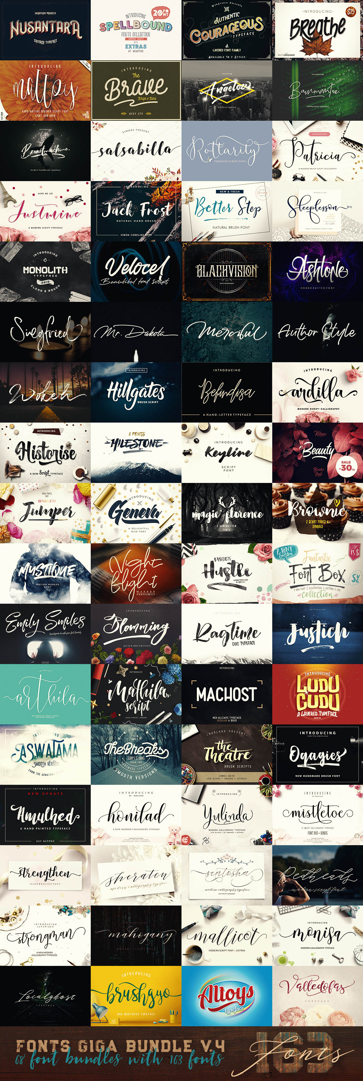 Fonts Giga Bundle v.4 – 163 Fonts contains 68 font bundles with 163 fonts and some extra graphics from 14 talented designers. Enjoy all these beautiful items and support 14 freelance authors in one! Thanks a lot 😉