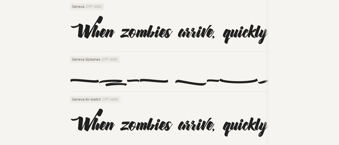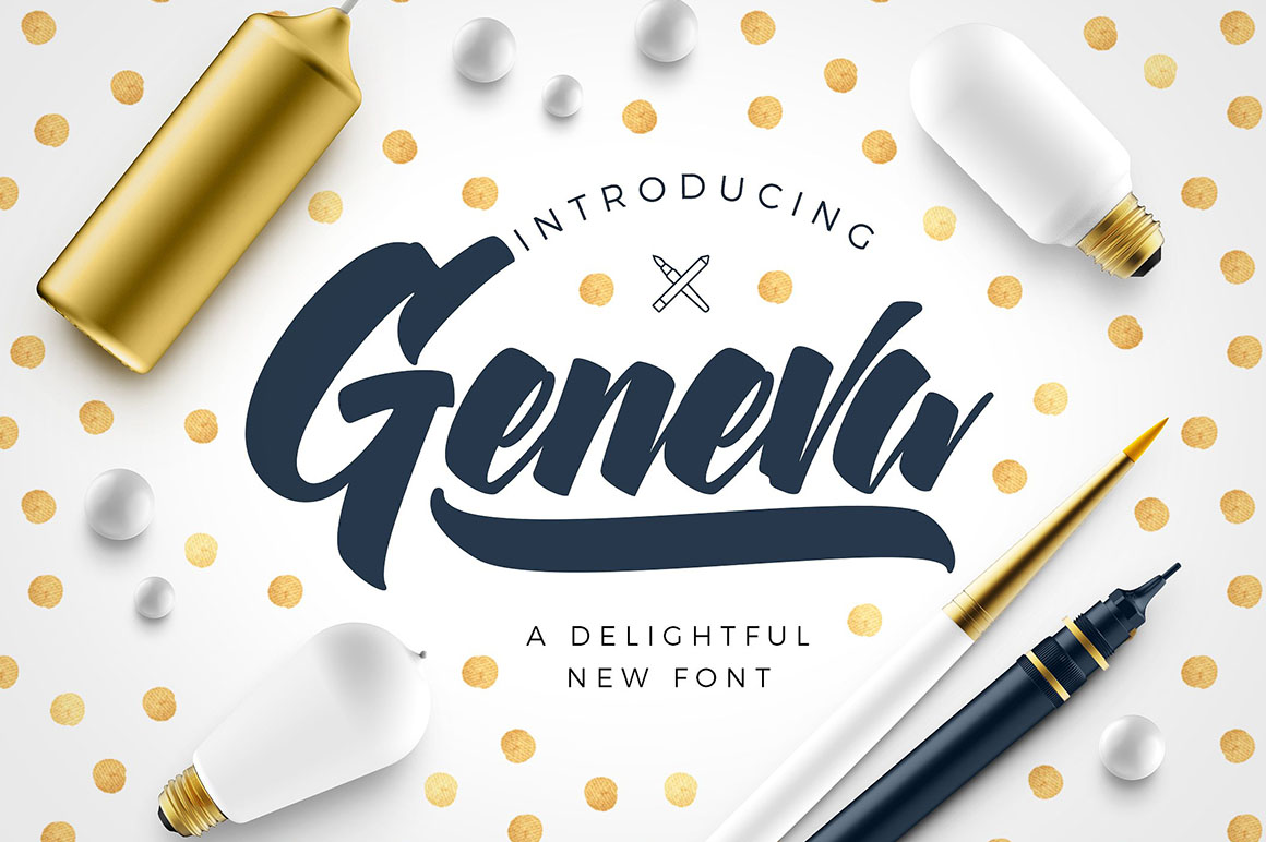 Geneva is a handlettering typeface with a brush style, it’s perfect for latterhead, apparel design, headline, logotype, poster, card, and etc. For folks who have opentype capable software : The alternates are accessible by turning on ‘Stylistic Alternates’ and ‘Ligatures’ buttons on in Photoshop’s Character panel, or via any software with a glyphs panel, e.g. Adobe Illustrator, Photoshop, Inkscape.