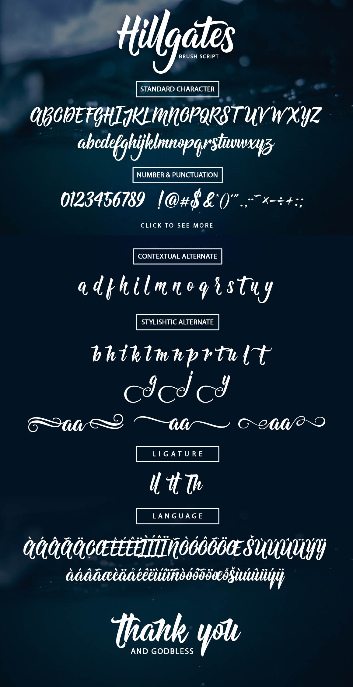 Introducing Hillgates Hand Brush Script Font, Come help you in terms of typography and lettering. For Reviews those of you who want a different font and classy and create something like you would expect. Font It Has a lot of variation in the OpenType features such as uppercase, lowercase, stylistic alternate, contextual alternate, ligature, numerals and punctuation and others that make it so very interesting font. The use of this font is great for Logotype, Letterhead, Poster, Apparel Design, labels, greeting cards, branding materials, business cards, quotes, posters, and many more! The Open Type features can be accessed by using Open Type savvy programs such as Adobe Illustrator, Adobe InDesign, Adobe Photoshop Corel Draw X version, And Microsoft Word. And this has given PUA Unicode Font (specially coded fonts). so that all the alternate characters Easily can be accessed in full by a craftsman or designer.