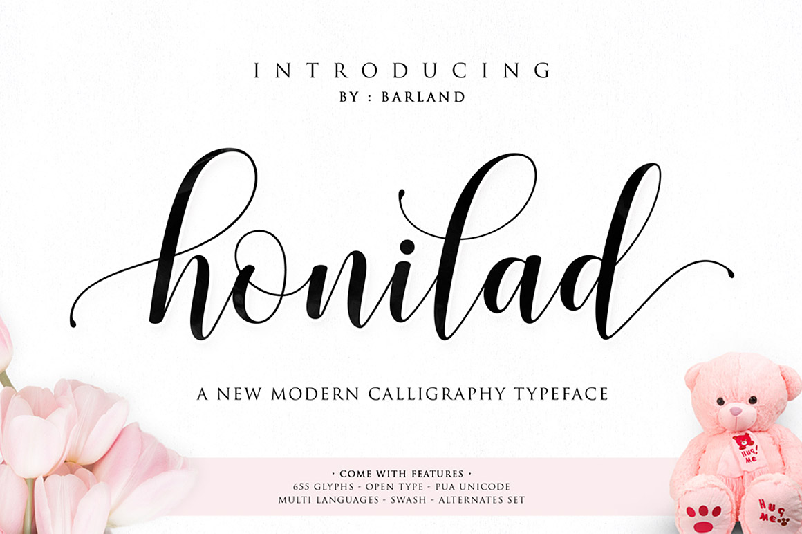 Introduce my new font Honilad Script is a unique blend of classic and modern font. imperfect style ups and downs, like a dance letters, smooth, clean and simple. Honilad Script perfect for wedding, event, invitation, escort card, table number, header menus, display, logos, slider blog, custom address, stamps, packaging, greeting card, etc. Honilad Script including alternate glyph and beautiful swirl in a font including stylistic sets, Ligatures etc. The Open Type features can be accessed by using Open Type savvy programs such as Adobe Illustrator CS, Adobe Indesign & CorelDraw X6-X7 and Microsoft Word. And this Font has given PUA unicode (specially coded fonts). so that all the alternate characters can easily be accessed in full by a craftsman or designer.