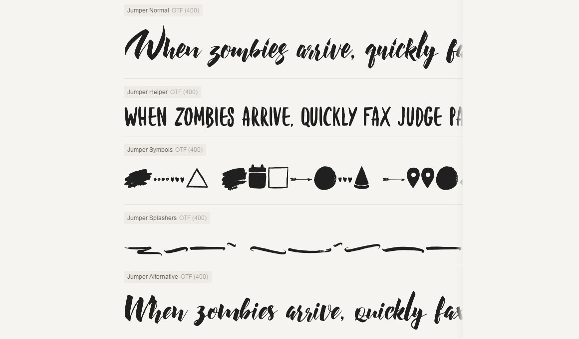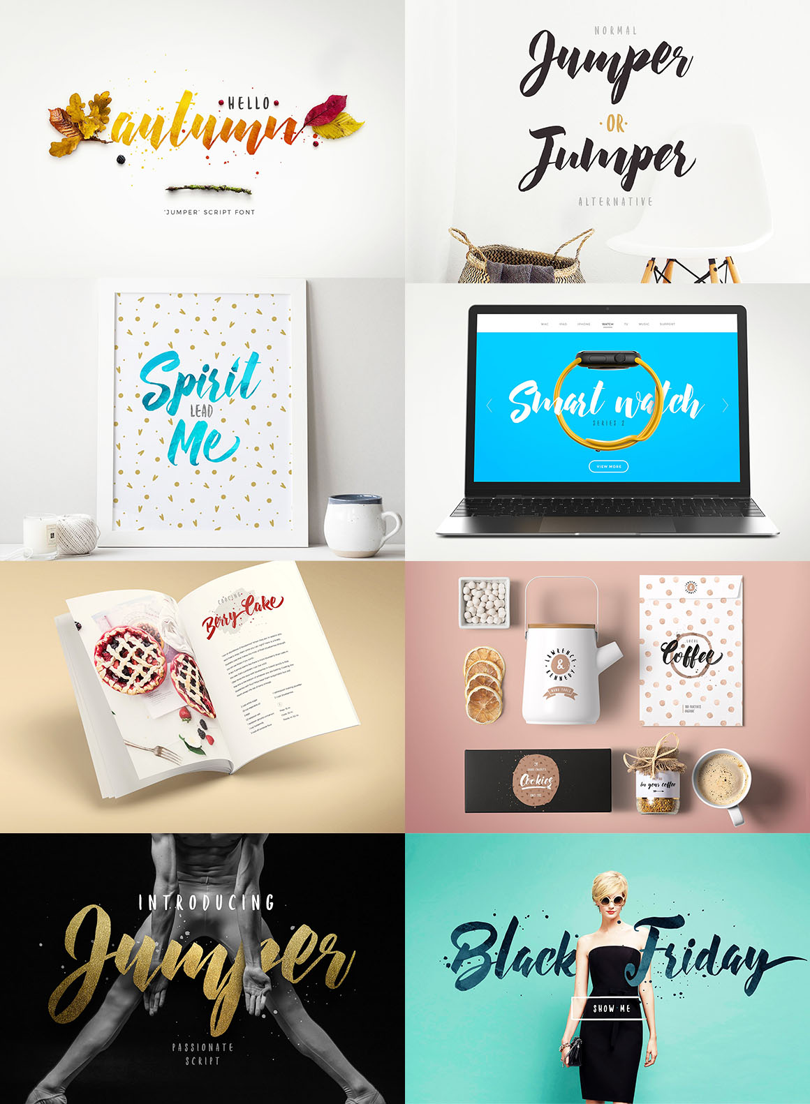 Jumper is a handlettering typeface with a brush style, it’s perfect for latterhead, apparel design, headline, logotype, poster, card, and etc. For folks who have opentype capable software : The alternates are accessible by turning on ‘Stylistic Alternates’ and ‘Ligatures’ buttons on in Photoshop’s Character panel, or via any software with a glyphs panel, e.g. Adobe Illustrator, Photoshop, Inkscape.