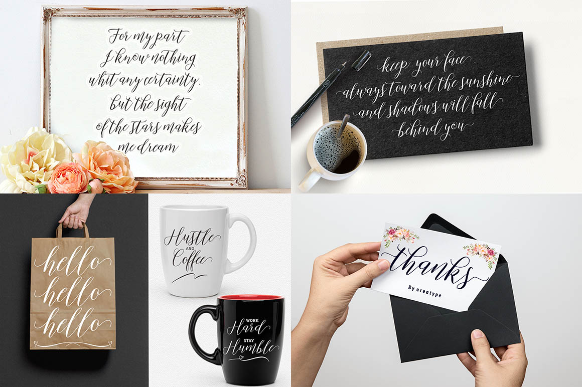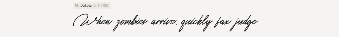 Introducing Mr. Dakota Script – a new fresh & modern script with a sweet calligraphy-style, decorative characters! So beautiful on invitation like greeting cards, branding materials, business cards, quotes, posters, and more! Mr. Dakota come with 222 glyphs. The alternative characters were divided into several OpenType features such as Stylistic Sets, Contextual Alternates, and Ligature. The OpenType features can be accessed by using OpenType savvy programs such as Adobe Illustrator and Adobe InDesign.