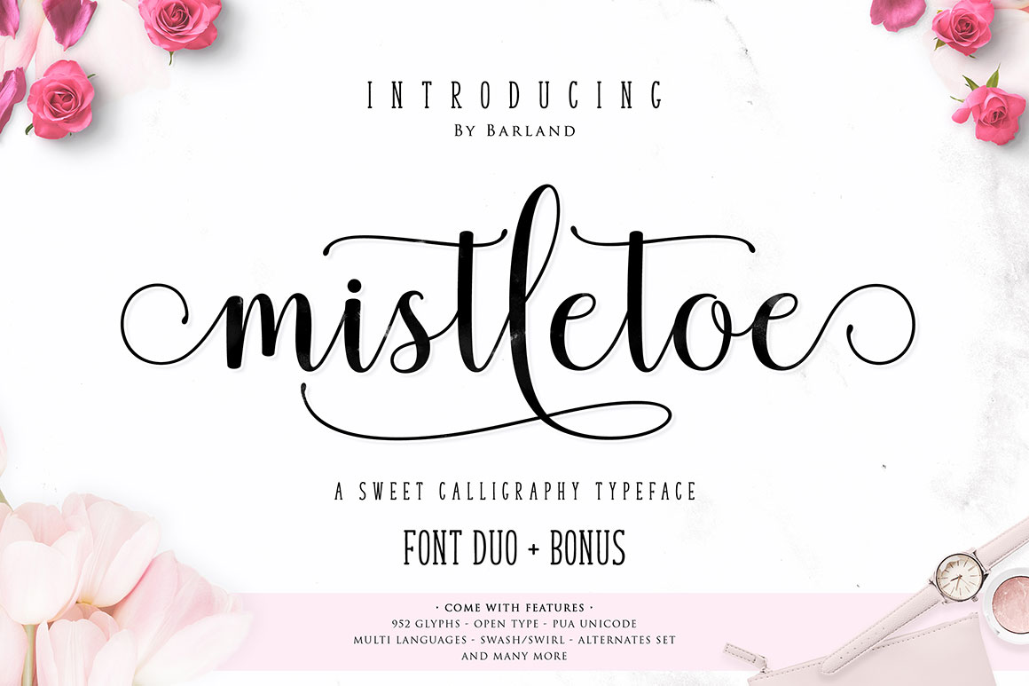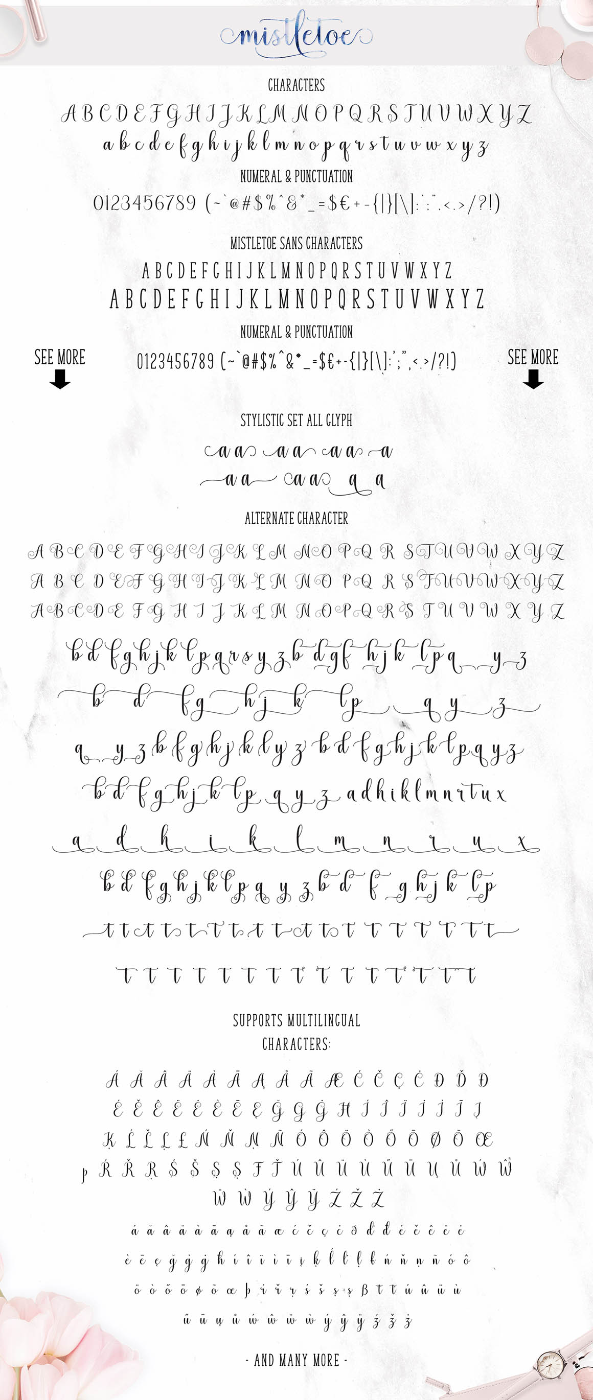 Introduce my new font Mistletoe Font Duo is a unique blend of classic and modern font. imperfect style ups and downs, like a dance letters, smooth, clean and simple. Mistletoe Font Duo perfect for wedding, event, invitation, escort card, table number, header menus, display, logos, slider blog, custom address, stamps, packaging, greeting card, etc. Mistletoe Font Duo including alternate glyph and beautiful swirl in a font including stylistic sets, Ligatures etc. The Open Type features can be accessed by using Open Type savvy programs such as Adobe Illustrator CS, Adobe Indesign & CorelDraw X6-X7 and Microsoft Word. And this Font has given PUA unicode (specially coded fonts). so that all the alternate characters can easily be accessed in full by a craftsman or designer.