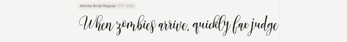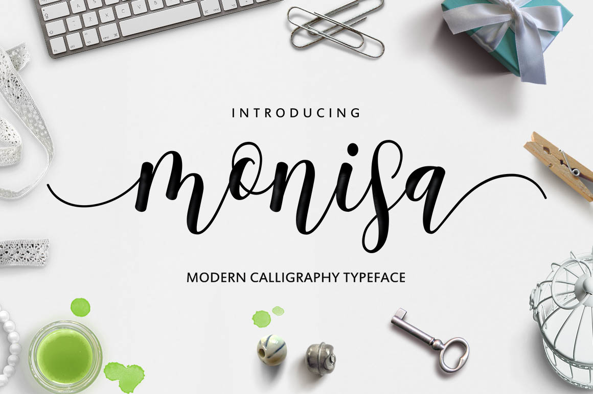 Monisa Script is a lovely calligraphic manuscript modern, I hope you are interested in this font, dynamic and pretty with swashes. Can be used for many purposes. such as title, signature, logo, wedding invitations, letterhead, signage, labels, newsletters, posters, badges, etc. Monisa Script features Open type, including the initial and terminal letters, ligatures and International support for most Western languages included.