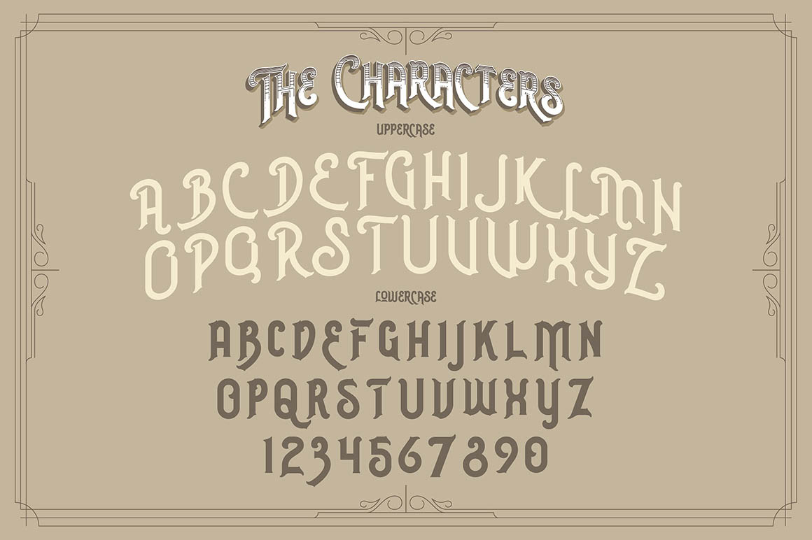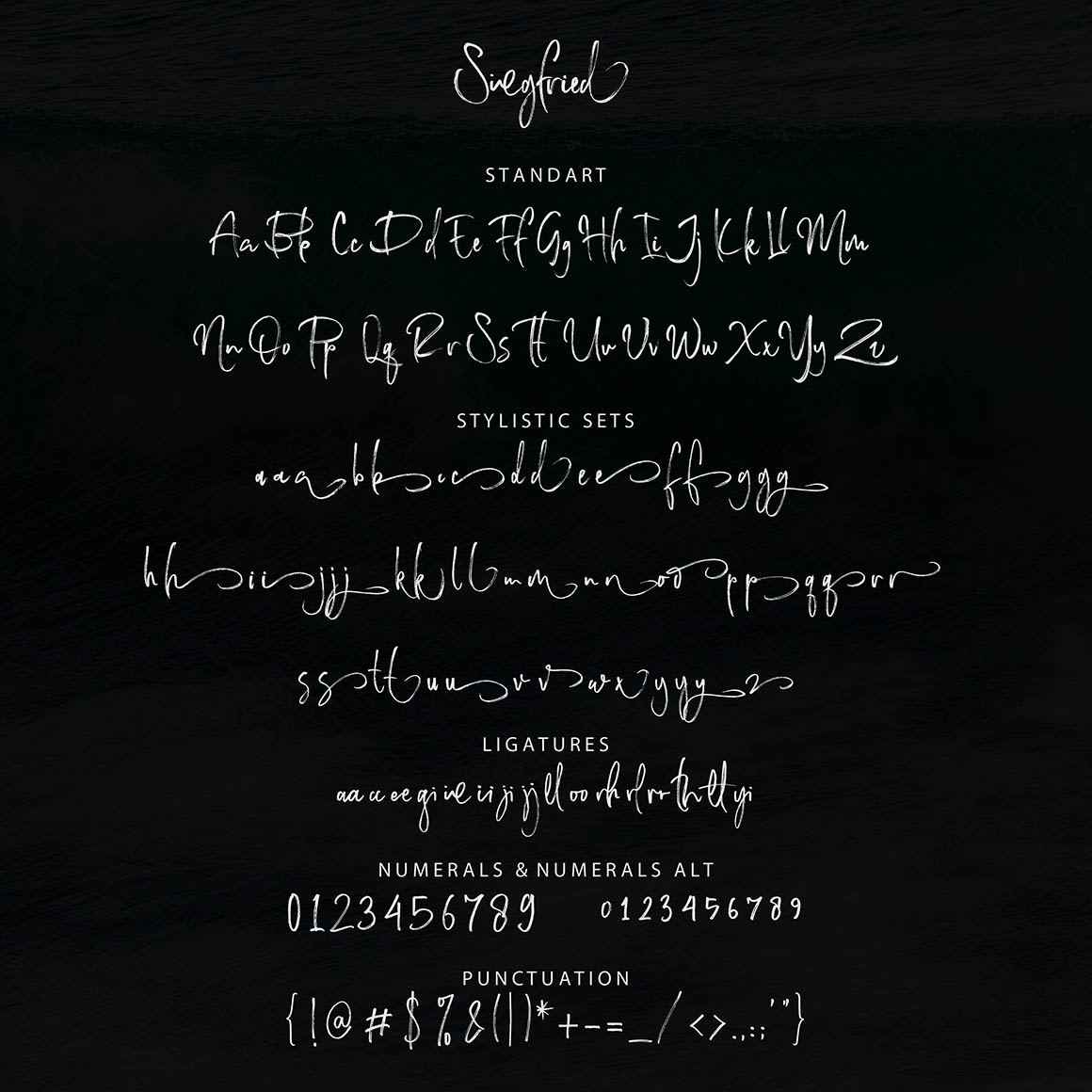 Siegfried are handmade with amazing character. Ideal for a logo, a name tag, handwritten quotations, product packaging, goods, social media and greeting cards. It contains a complete set of lower and upper case letters, assorted punctuation, numbers, and multilingual support. The font also contains several ligatures and contextual alternates for lower case characters, accessible in the Adobe Illustrator Glyphs panel, or under Stylistic Alternates in the Adobe Photoshop OpenType menu. But If you don’t have any opentype specific software, you can still use Siegfried as is with its standard lowercase and uppercase letters.