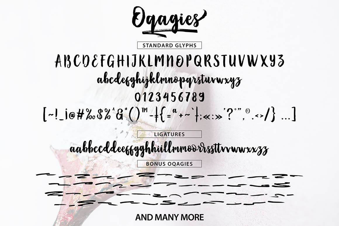 ” Oqagies Brush ” is a hand-made marker pen fonts, designed to create stunning hand-lettering quickly and easily. Also comes with 17 bonus, ideal for giving your text that final touch of finesse! Perfect for projects brands, the title, logo, correspondence, signage, labels, newsletters, badges, t-shirt, logos, product packaging, posters, news, blogs, everything including personal charm. ” Oqagies Brush ” including 341 glyphs and including stylistic sets, Ligatures etc. The Open Type features can be accessed by using Open Type savvy programs such as Adobe Illustrator CS, Adobe Indesign & CorelDraw X6-X7 and Microsoft Word. And this Font has given PUA unicode (specially coded fonts). so that all the alternate characters can easily be accessed in full by a craftsman or designer.