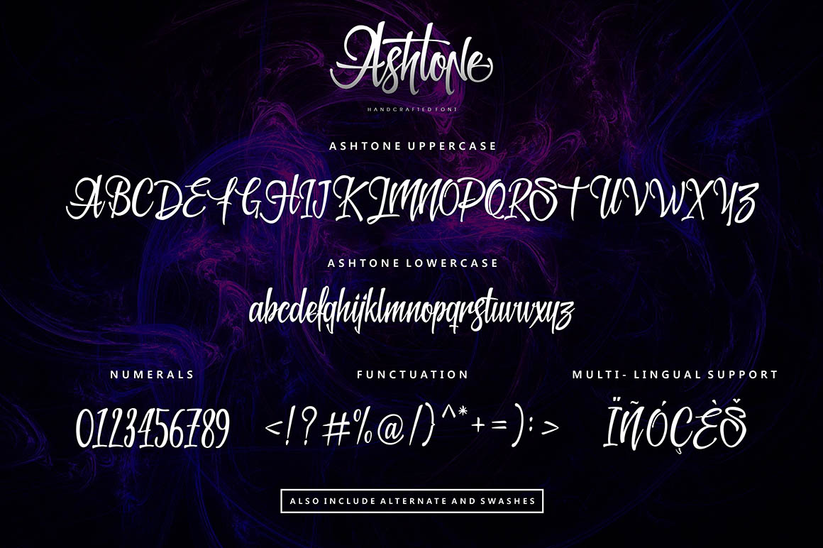 Ashtone is new font from Rvq Typefoundry, elegant feel character set. To create the beautiful combination, just mix the uppercase and lowercase then mix with the alternative glyphs and playing with swash. The Ashtone script includes a full set of capital and lowercase letters, as well as multi-lingual support, currency figures, numerals, punctuation & some extra glyphs.