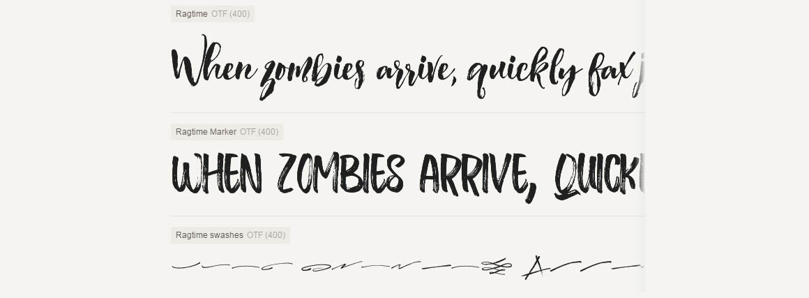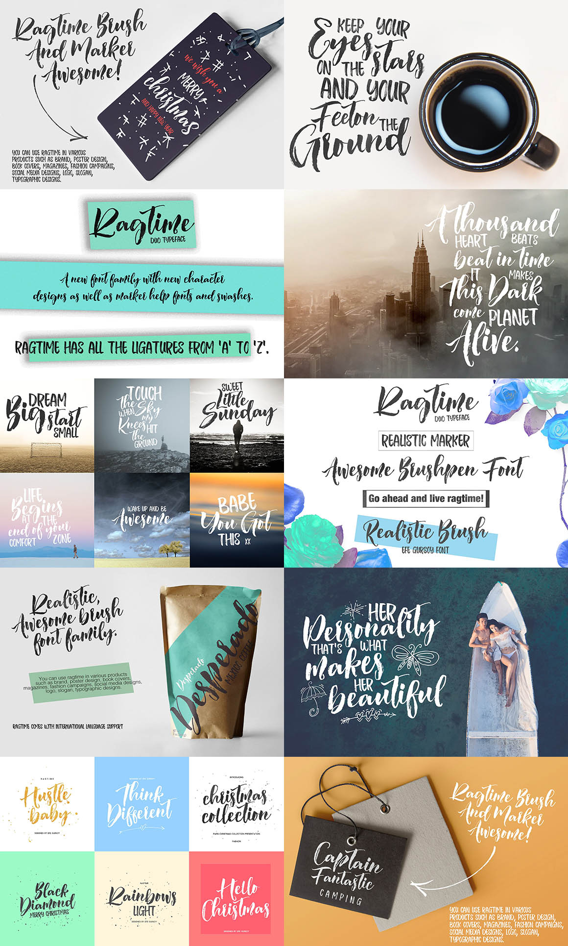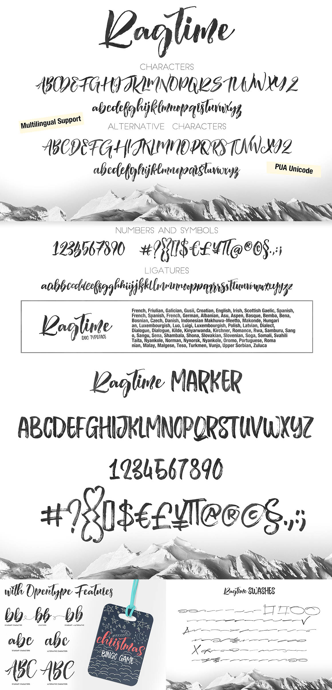 A new font family with new character designs as well as marker help fonts and swashes. Ragtime has all the ligatures from ‘a’ to ‘z’. Alternative upper and lower case has included. These include pua unicode. You can use ragtime in various products such as brand, poster design, book covers, magazines, fashion campaigns, social media designs, logo, slogan, typographic designs.