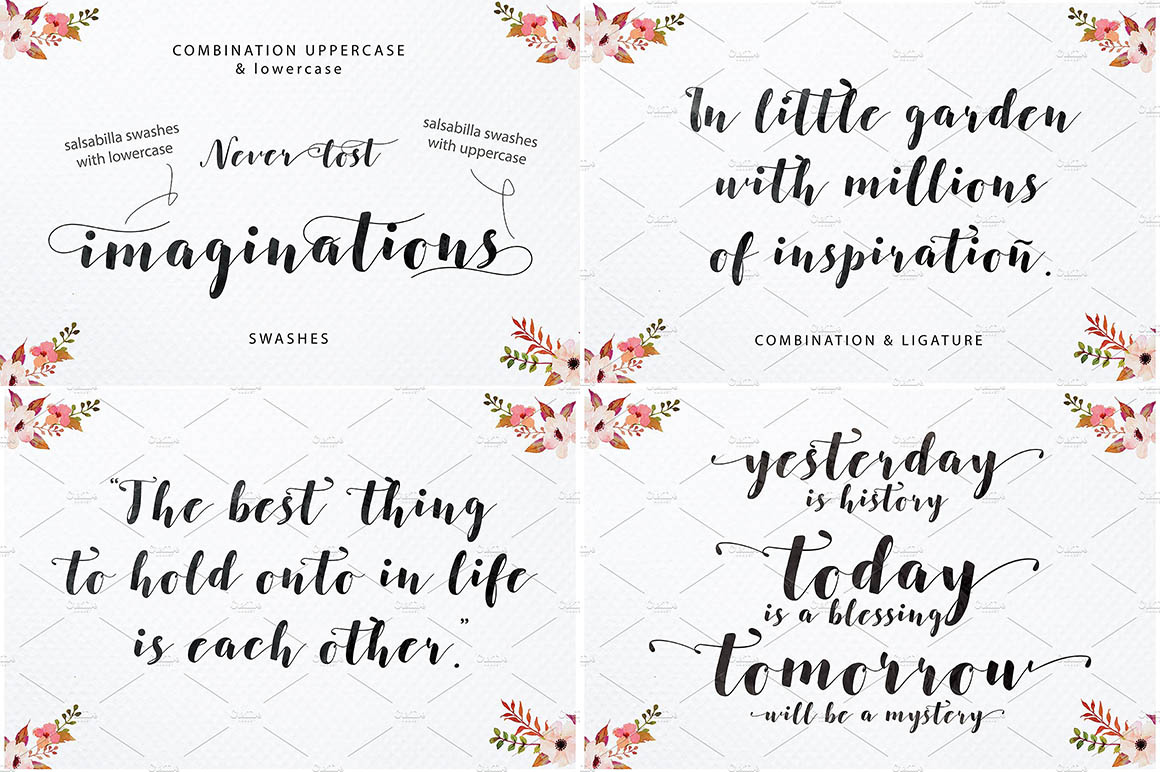 Salsabilla is a smooth hand calligraphy, modern calligraphy wavy, which was created to meet the needs of your next design project. Salsabilla, Can used for various purposes. such as the title, logo, correspondence, wedding invitations, letterhead, signage, labels, newsletters, posters, badges, t-shirt, etc. Also supports in program, Adobe Illustrator, Adobe Photoshop, Adobe InDesign, Corel Draw X version, Microsoft Word. If want access salsabilla swashes glyphs using caps lock (UPPERCASE for end swashes/lowercase for the first swashes) including swashes for first and last letters. Please note that not all swashes perfectly fit every letter when first typed, but a little position-tweaking should allow you to add some really unique your styles. The Features of this fonts is: Standart ligatures, Stylistic Alternates.