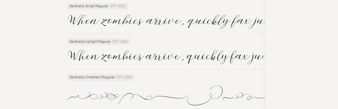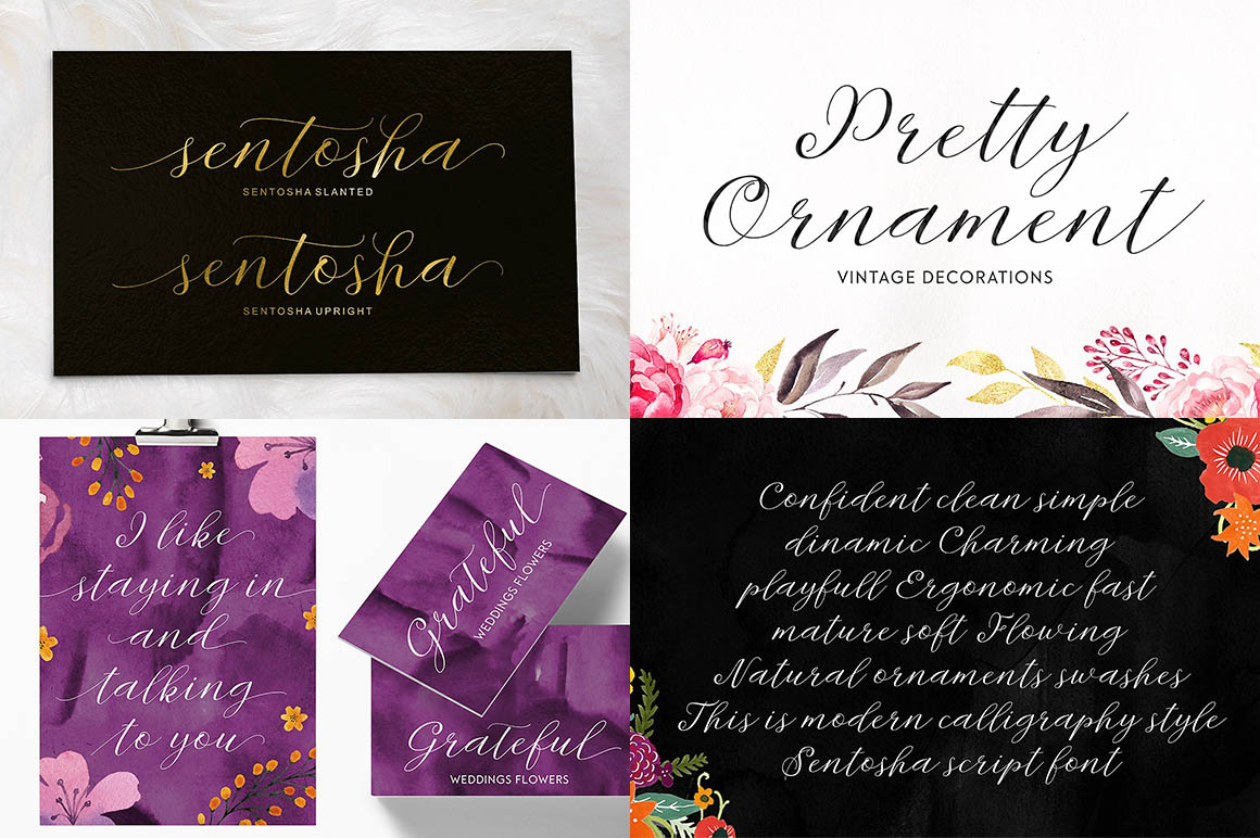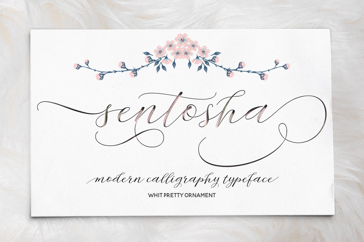 Sentosha Script is a modern calligraphy typeface, casual and pretty with swashes + ornaments. Can be used for many purposes. such as title, signature, logo, wedding invitations, letterhead, signage, labels, newsletters, posters, badges, etc. Sentosha Script features Open type, including the initial and terminal letters, alternates, ligatures and International support for most Western languages included. To activate OpenType Stylistic alternative, you need a program that supports OpenType features such as Adobe Illustrator CS, Adobe Indesign and CorelDraw X6-X7, Microsoft Word 2010 or later.