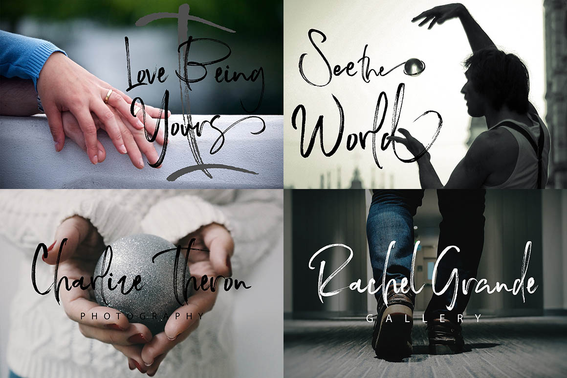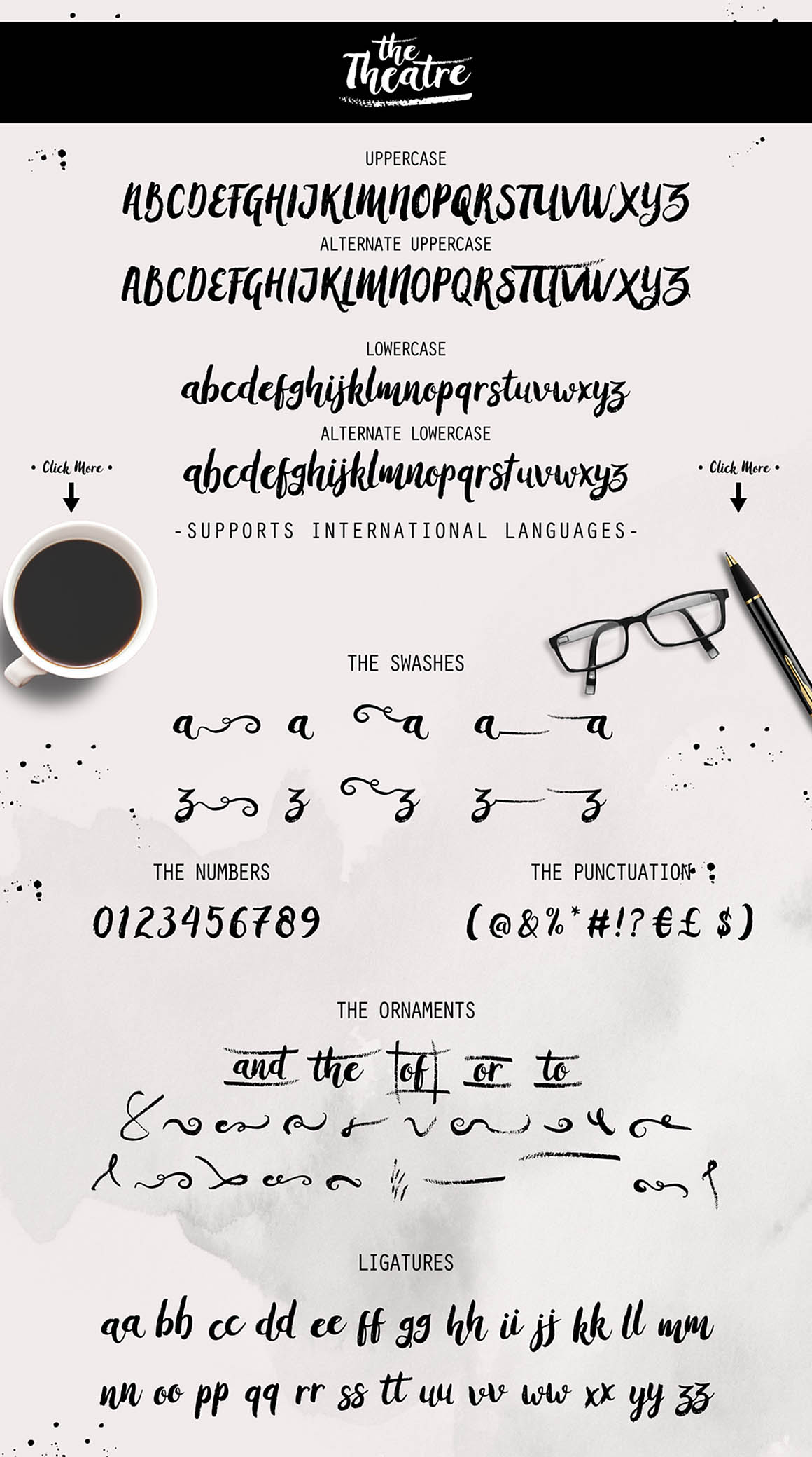 The Theatre Brush a new hand elegant brush script font. This font will look gorgeous on all your designs, branding materials, blog headers, business cards, quotes, invitations and more!! The Theatre Brush come with 636 glyphs. The alternative characters were divided into several Open Type features such as Swash, Stylistic Sets, Stylistic Alternates, Contextual Alternates, and Ligature. The Open Type features can be accessed by using Open Type savvy programs such as Adobe Illustrator, Adobe InDesign, Adobe Photoshop Corel Draw X version, And Microsoft Word. And this Font has given PUA unicode (specially coded fonts). so that all the alternate characters can easily be accessed in full by a craftsman or designer.