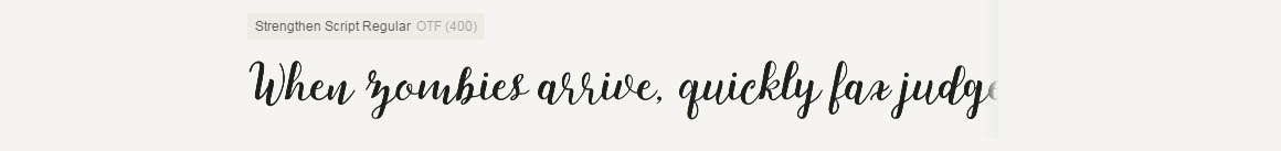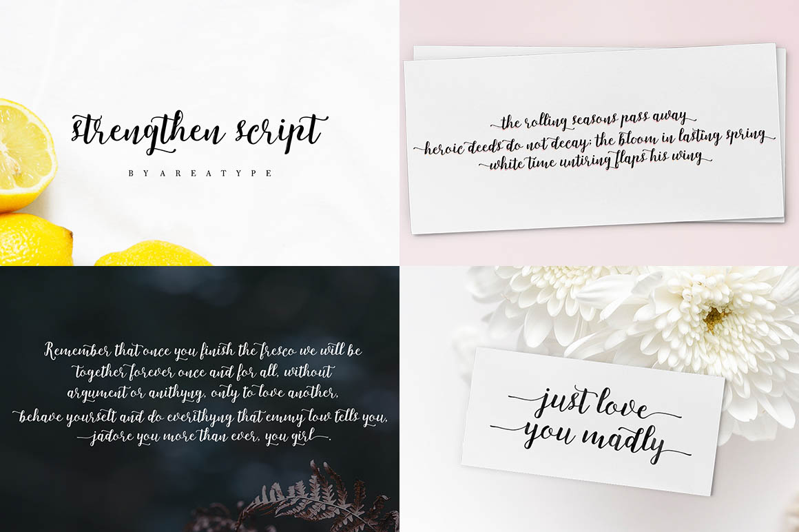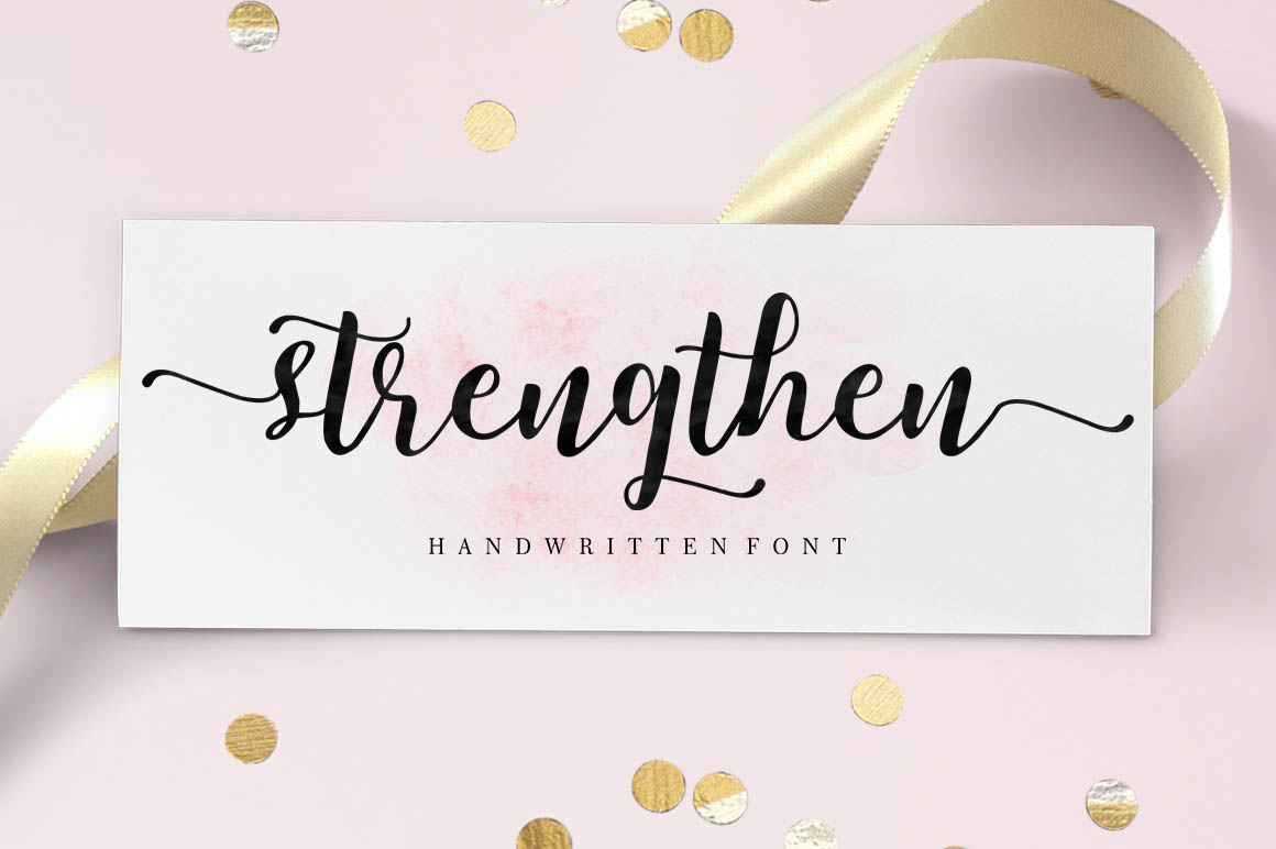 Strengthen Script is a lovely calligraphic manuscript modern, I hope you are interested in this font, dynamic and pretty with swashes. Can be used for many purposes. such as title, signature, logo, wedding invitations, letterhead, signage, labels, newsletters, posters, badges, etc. Strengthen Script features Open type, including the initial and terminal letters, ligatures and International support for most Western languages included.