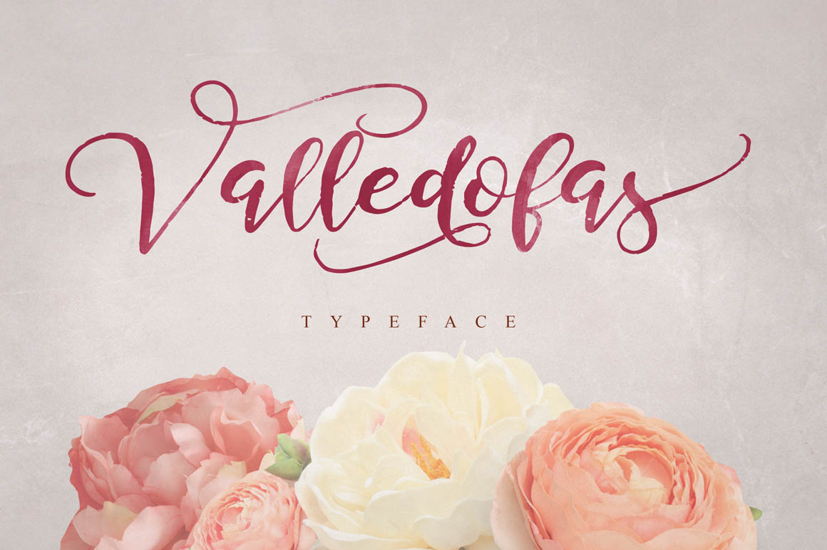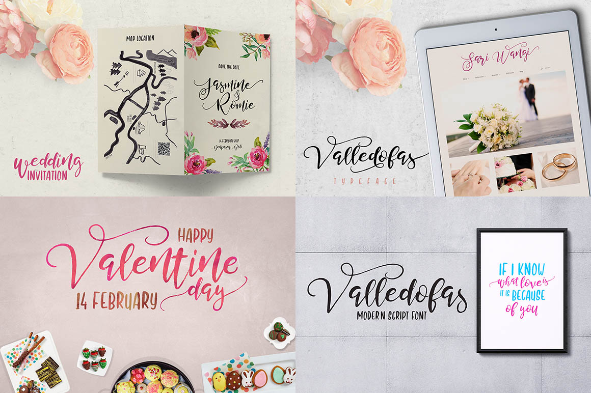 Introducing Valledofas Typeface modern script typeface, using style hand made with brushing. Get a Valledofas Second Typeface ( bonus ) using handmade sans serif style. Valledofas Typeface a beautiful for wedding card design, logotype, website header, Valentines day design, fashion design and any more.