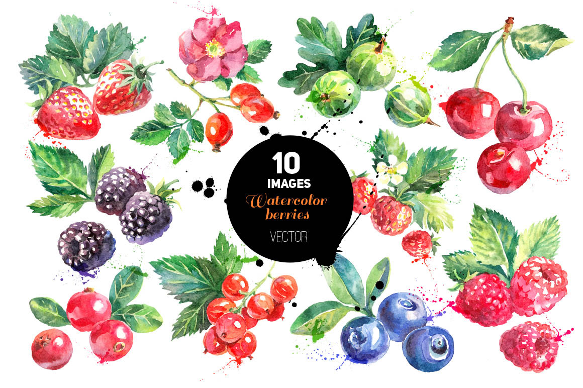 Set of 10 hand drawn watercolor berries. Traced vector illustrations. Zip file contains editable 10 EPS vector files and 10 JPEG images.