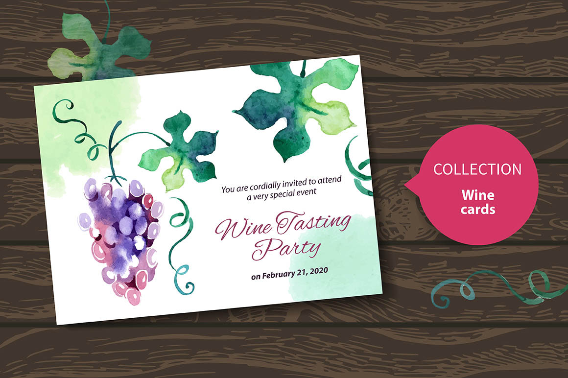Set of watercolor grapes and wine elements. Vectorized illustrations + BONUS! Set of 4 Wine Tasting Party Cards. Zip file contains 8 editable EPS vector files and 8 high resolution JPEG images.