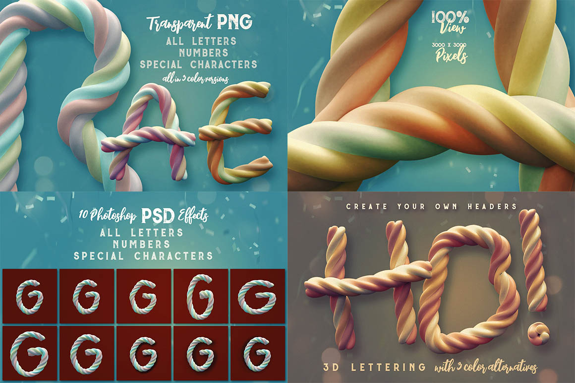 Hi-res 3D marshmallow twisted candies style letter renders (3000×3000 – but letter size is around 1500×2000). Great for your headers, posters, advertisments – any web or print projects. You’ll find here also layered PSD file with 10 effets (shadows, effects…) – just replace letter in smart object and you’ll see letter in all 10 effects.