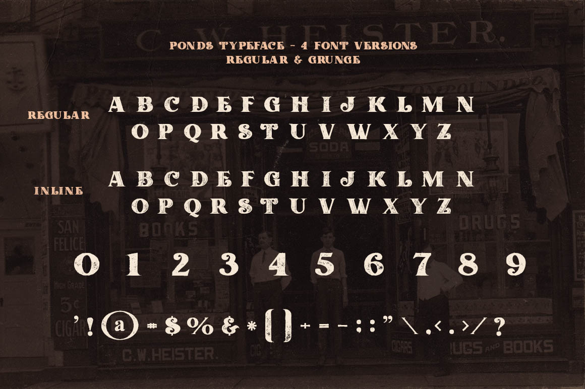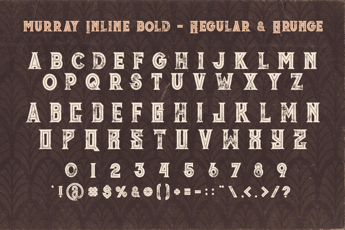 Unique vintage or retro style custom serif font with 6 styles: regular and grunge, inline and inline grunge, inline grid and inline grid grunge!