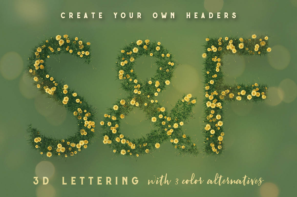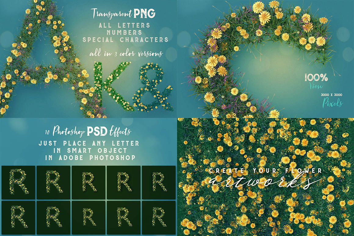 Hi-res 3D grass or summer flower lettering renders (3000×3000 – but letter size is around 2000×2000). Great for your headers, posters, advertisments – any web or print projects. You’ll find here also layered PSD file with 10 effets (shadows, effects…) – just replace letter in smart object and you’ll see letter in all 10 effects.