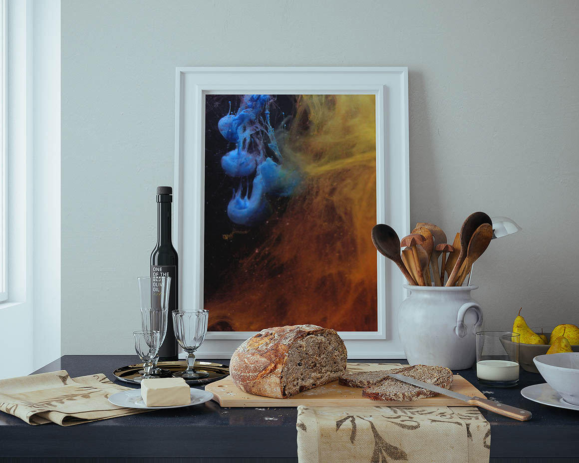 Cool kitchen workspace with frame presentation mock-up template from GraphicTwister. Download & enjoy 😉