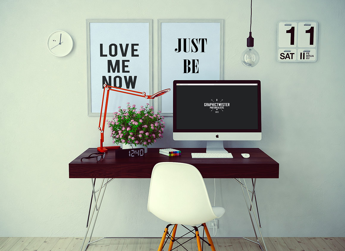 Cool workspace with iMac presentation mock-up template from GraphicTwister. Perfect to present your new website design! Download & enjoy 😉