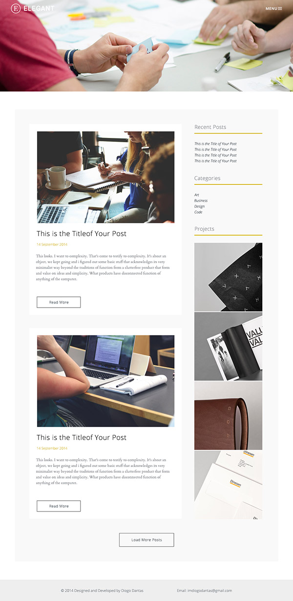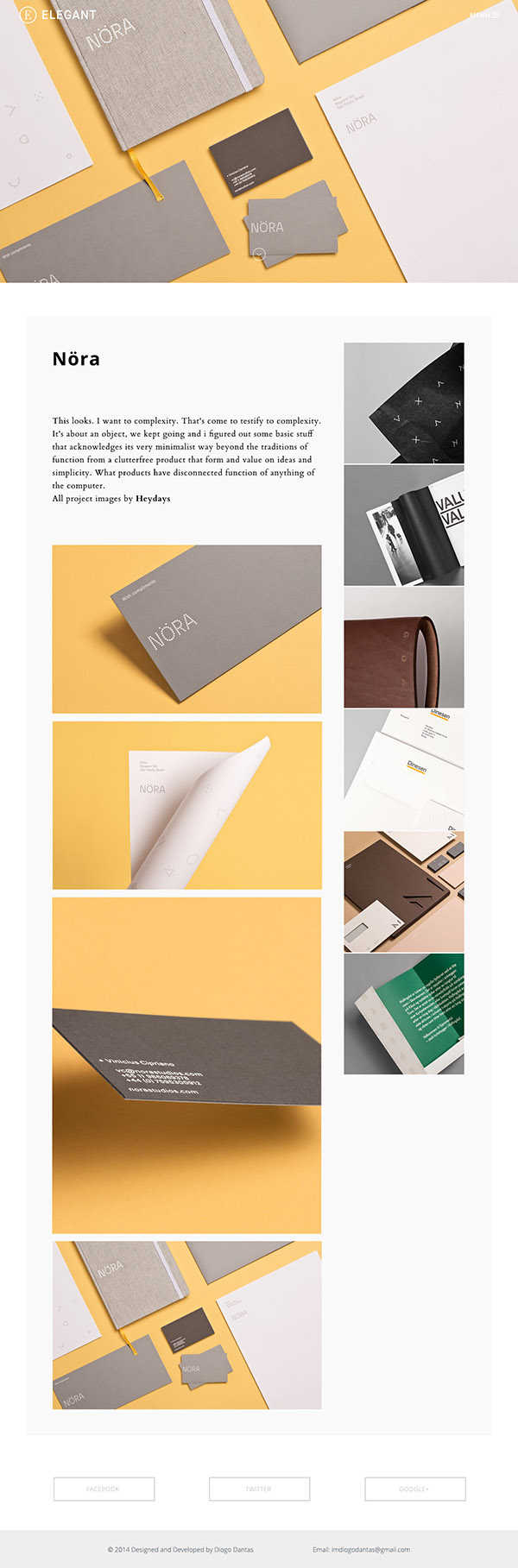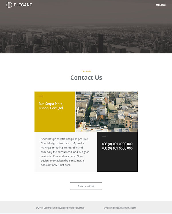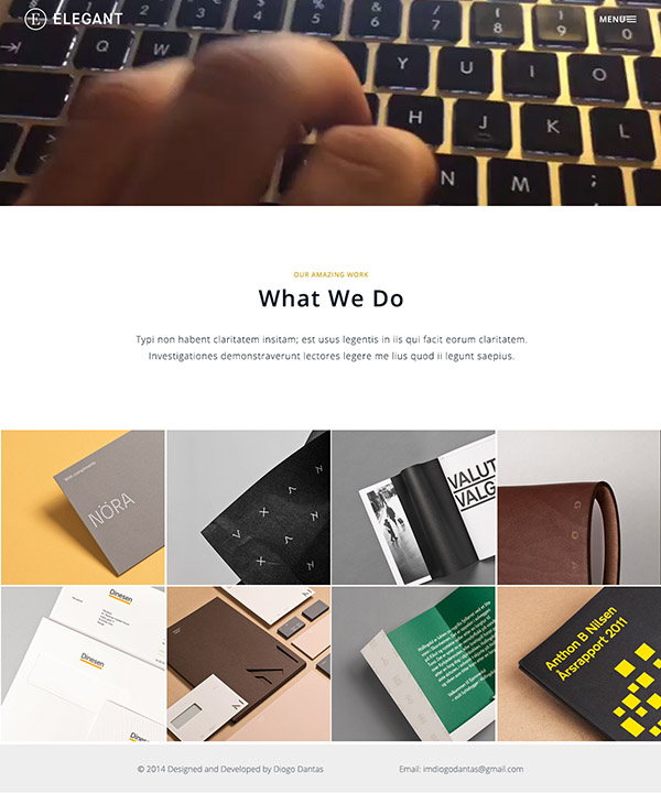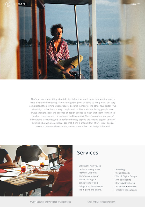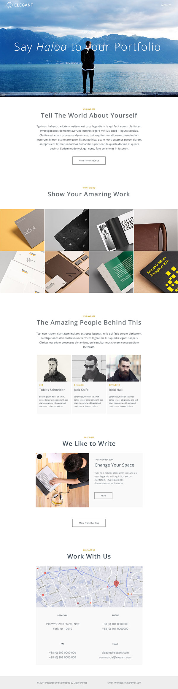 Free clean & elegant HTML/PSD theme from Diogo Dantas. Talented designer from Lisbon, Portugal. Check his behance portfolio here!