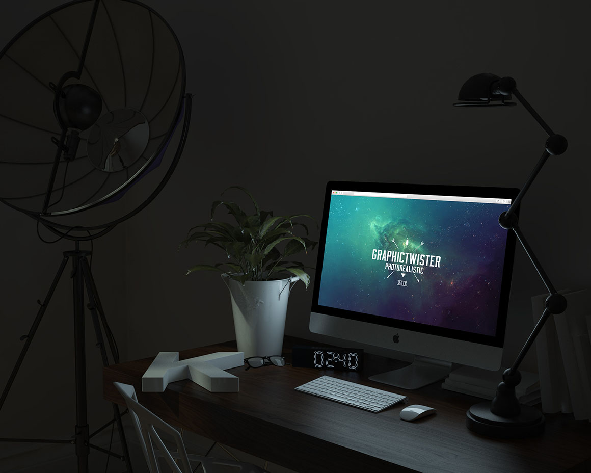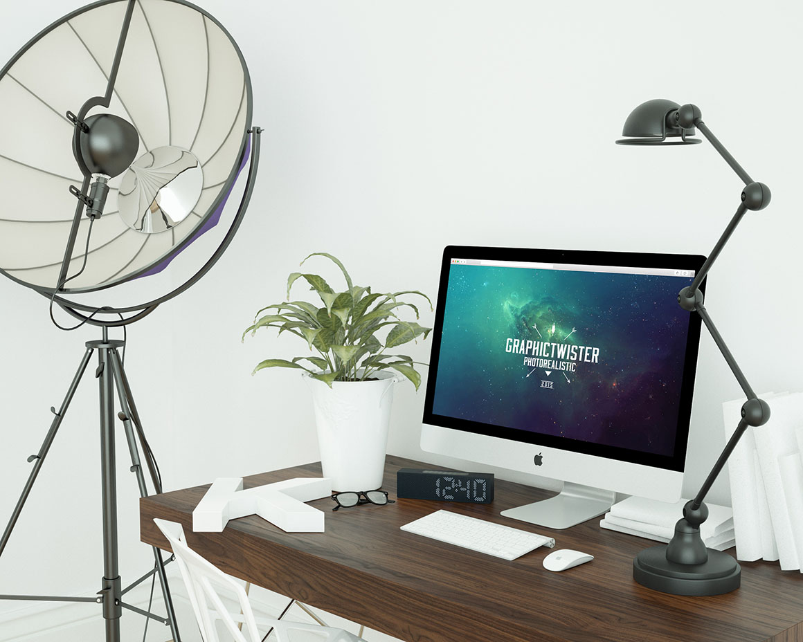 Cool workspace with iMac presentation mock-up template from GraphicTwister. Perfect to present your new website design! Download & enjoy 😉