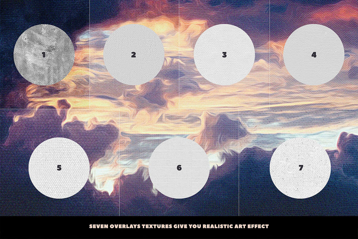 - 7 overlay textures gives you super realistic canvas or paper look.