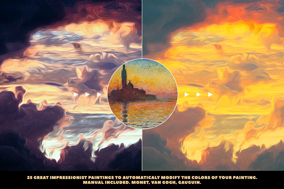 - 25 Great impressionist paintings – Monet, Gauguin, Van Gogh to match the colors of your draw. (PDF Manual included)
