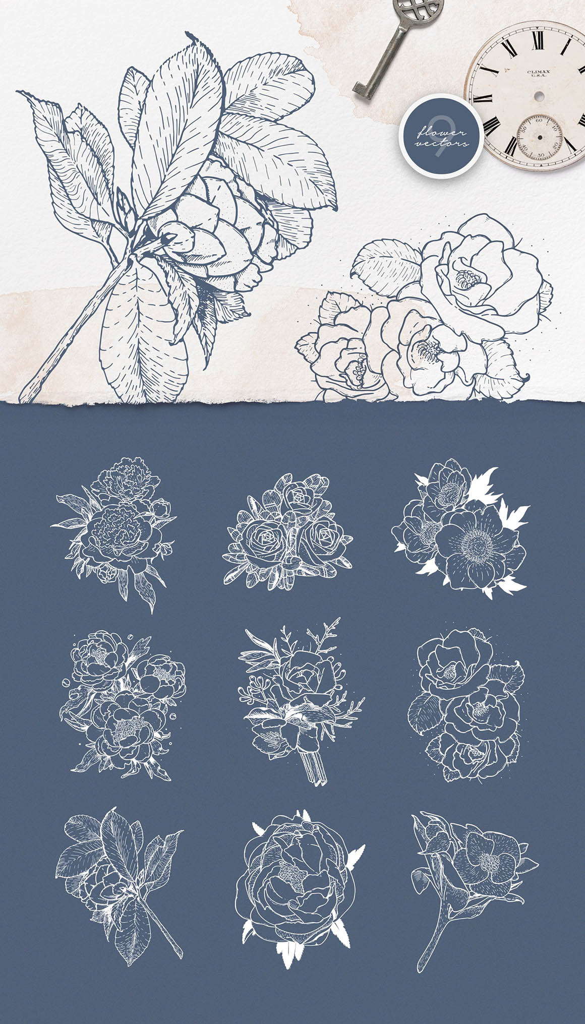 I got my inspiration from ancient botanic albums with lovingly sketched flowers and thin yellowish pages. Knowing how much you enjoy these vintage vibes I’ve added some modern look to them and here it is! The artistic collection includes 40 brushes for Photoshop and 9 bloomy vector illustrations, and I hope you will have lots of fun having them on your invitations, stationery, cards, t-shirts and so much more!