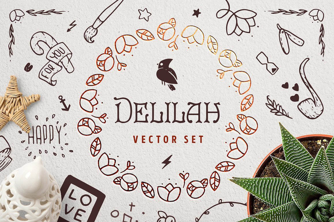 I’m happy to introduce you my new decorative toolkit, the Delilah Vector Set. It’s a creative collection of vector graphics including pre-made frames, animal illustrations, floral and berries, ribbons and many other decorative elements. Just pick vectors that fit most for your next invitation design, business card, or maybe a poster for a hipster coffee shop 🙂 Besides, an included texture set would be a great bonus to the Delilah Set that will bring you so much fun and joy in your work. Your hand-drawn compositions would look just fabulous with golden and metallic textures overlay 😉