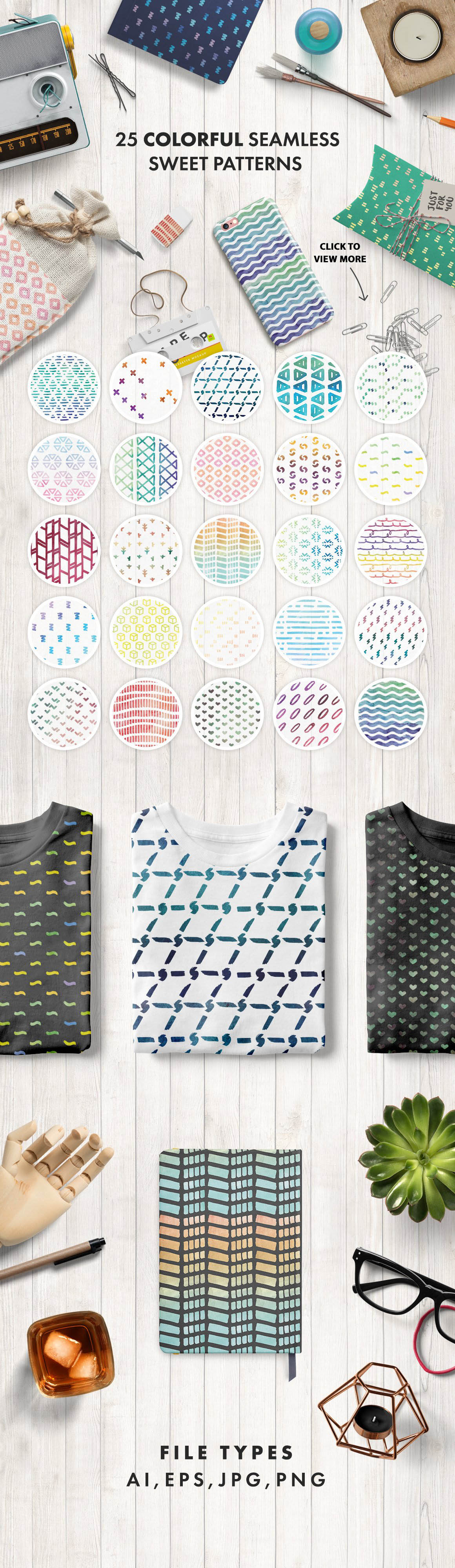 • 25 Colorful Seamless Patterns in Vector EPS Format;