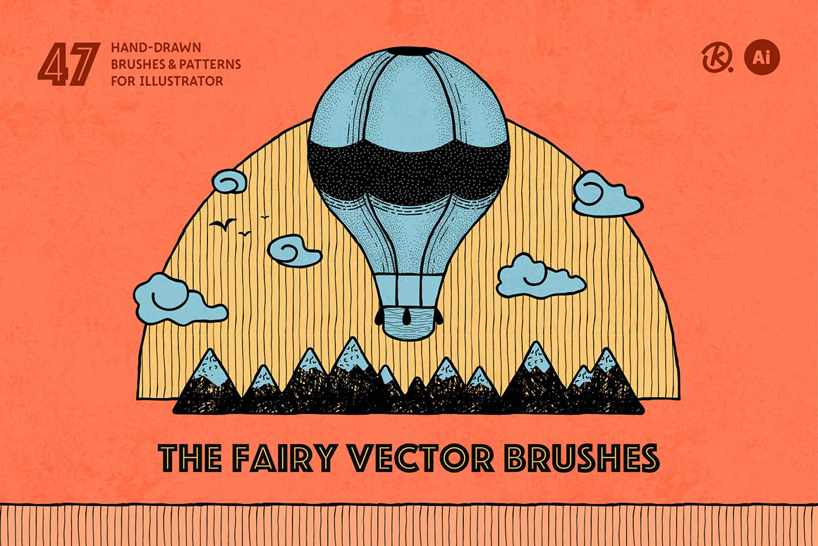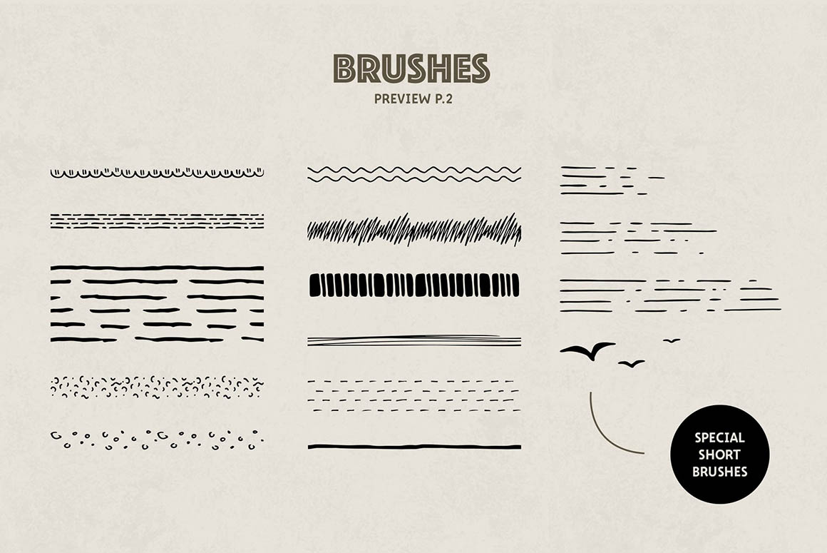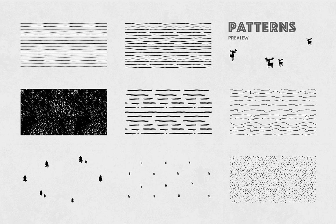The result of my sleepless night is 47 hand-drawn brushes & patterns for Adobe Illustrator CC, where I’ve united all sorts of strokes you must love (straight and rough outlines, dots and dashes, stippling, hatching) on your images, dreamy motives of fir trees, moose, giraffe skin and high-flying birds. Just pick the ones you need and bring mood and spirit to an illustration and let it look different — like the one from your adventure novels book, where it’s good to take risks!