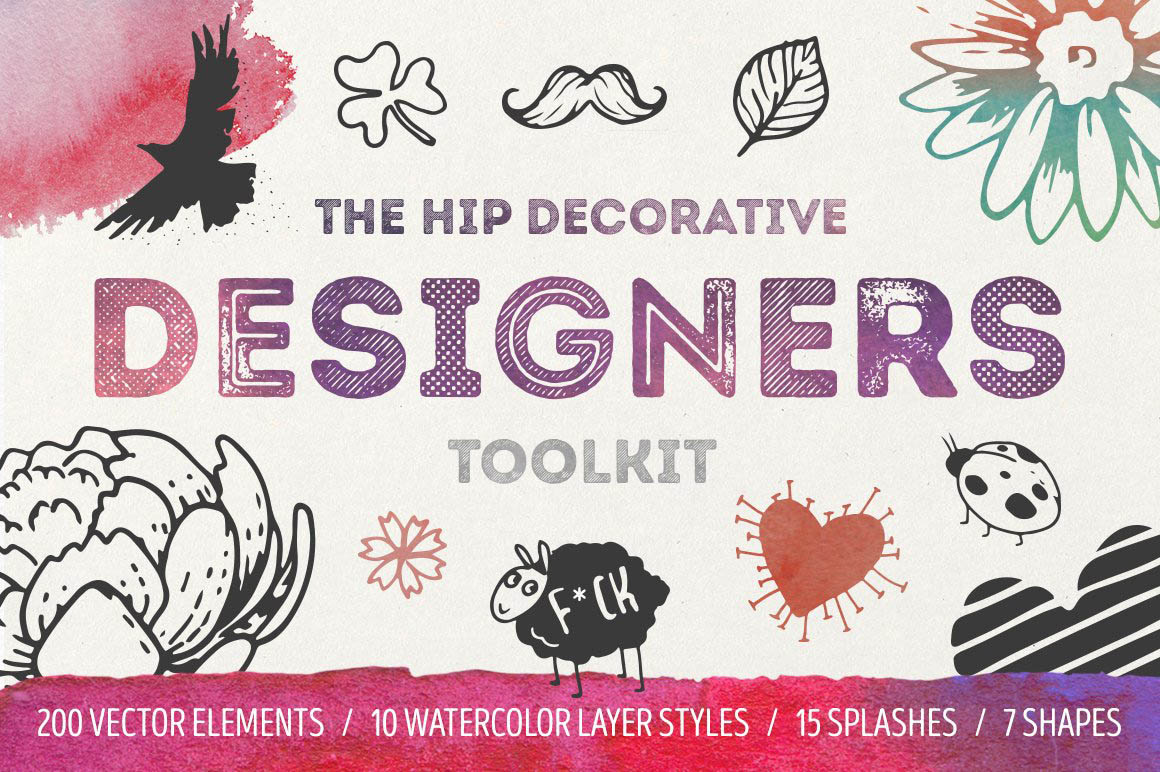 It is a great joy for me to introduce you my new product, a massive collection of decorative elements. It’s a huge vector set and a collection of watercolor elements and styles. I did everything I could to make this pack not only as valuable as possible but give it a unique, outstanding style. I sincerely hope you will enjoy it!