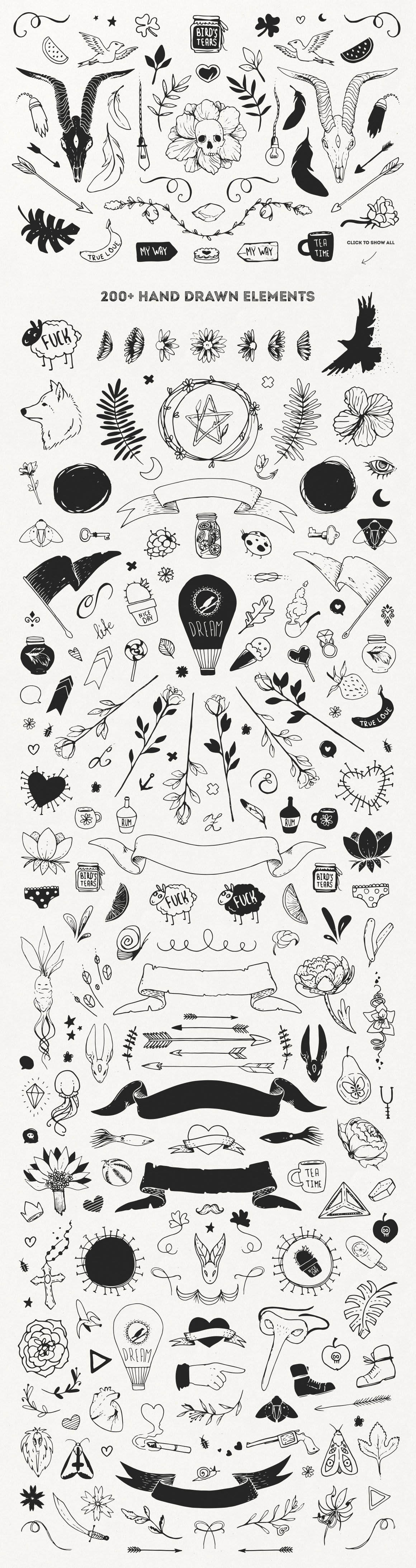 Ready for new hand-drawn goodies?! Well, I glad to present you this pack with over 160 hand-drawn elements for your creative pleasure (arrows, ribbons, beams, decoration elements and even some magic creatures). Wide range of use can make it an irreplaceable part of your toolbox. In the package you will find elements for creating logos, labels, prints, patterns, greeting cards and many other.