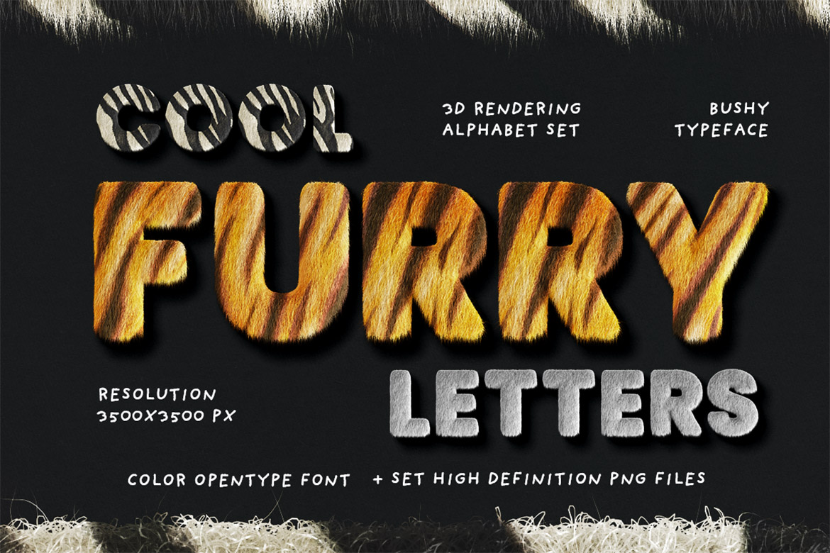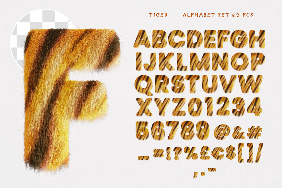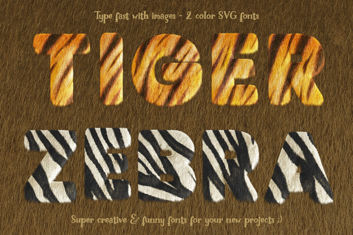 - 2 cute or zebra & tiger color SVG fonts + 2 hi-res transparent PNG alphabets (3500 x 3500 pix)