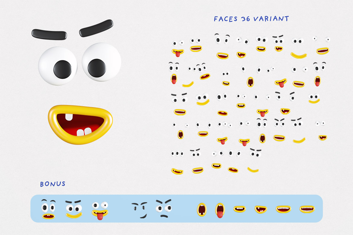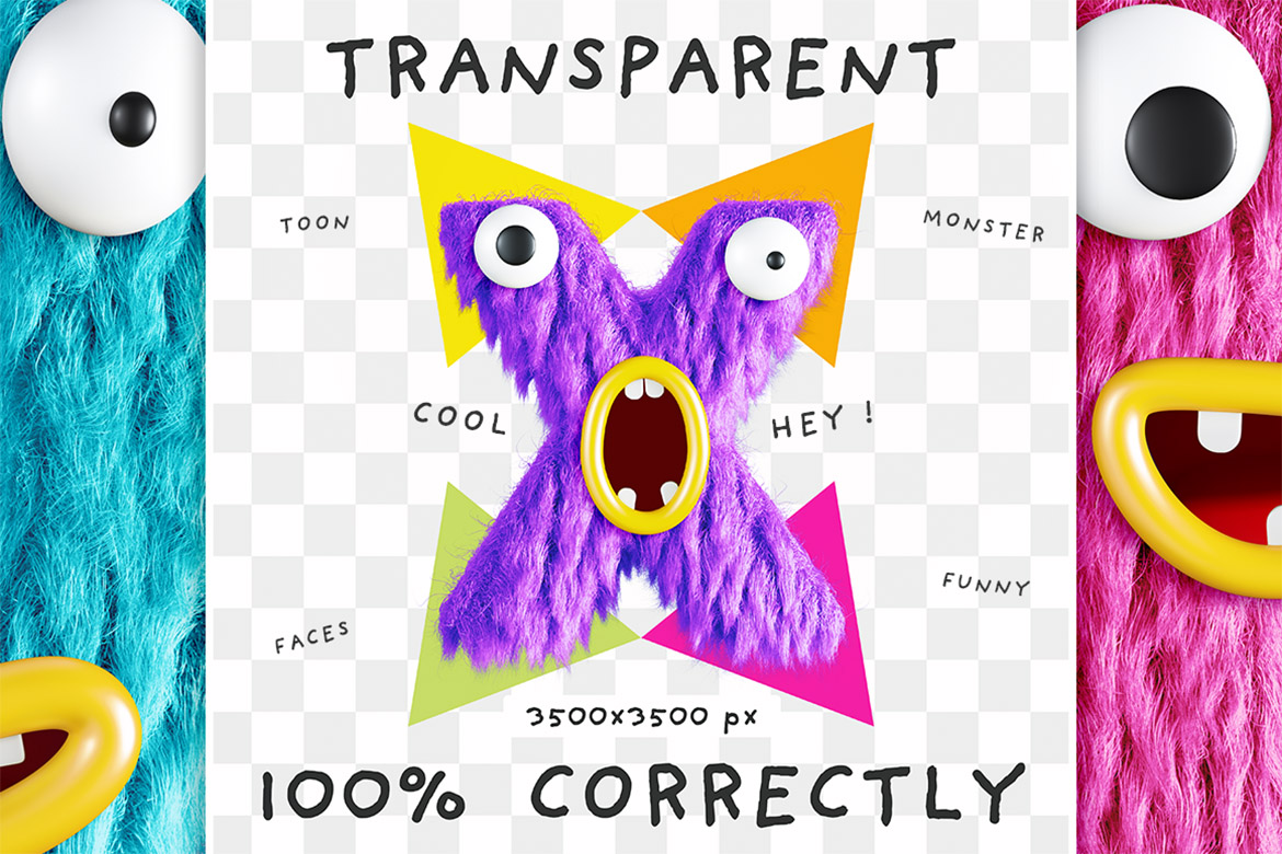 - transparent PNG images with mosnter faces (also few bonus faces are included)