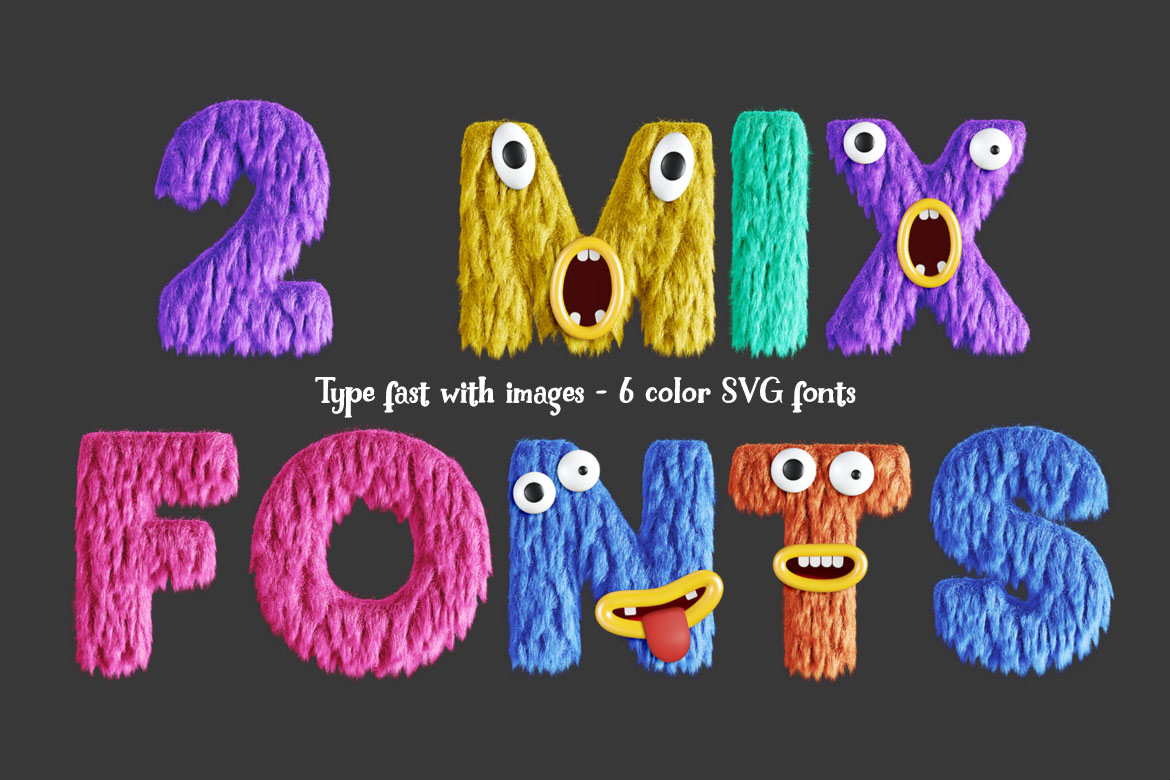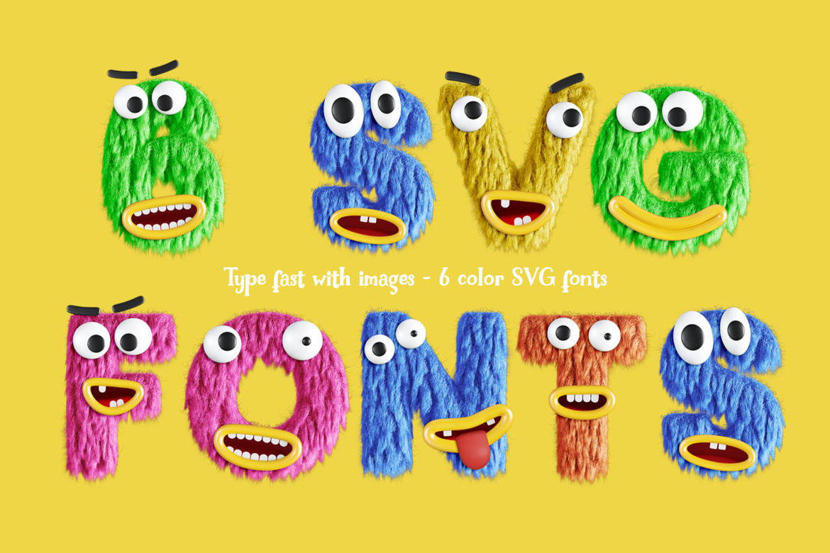 - 6 cute or friendly monster color SVG fonts + 6 hi-res transparent PNG alphabets (3500 x 3500 pix)