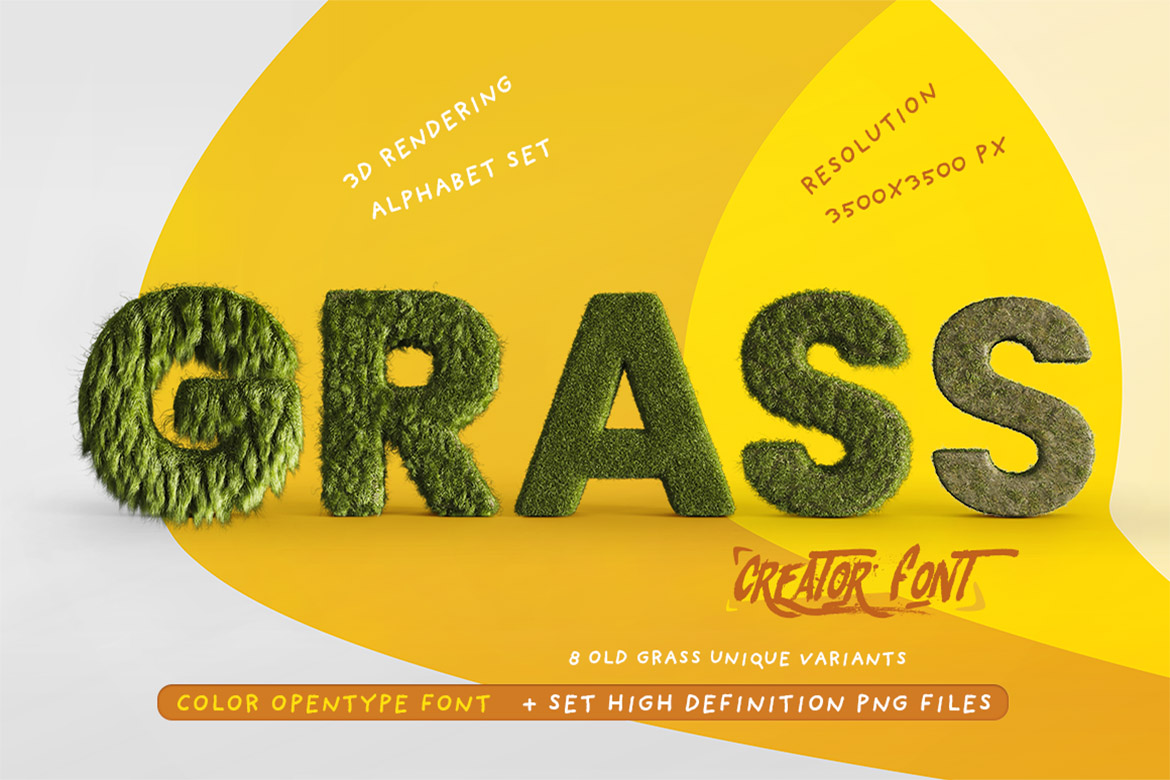 Super creative, playful & unique grass graphic & typography creator with 24 color SVG fonts + 32 PNG image alphabets + some other bonus graphics. If you need to create original grass style or cute monster typography artwork in minutes you need to check this bundle! All these PNG graphics are hi-res so really great for any print or web projects. Great for original print design, banner, social media post or any graphic promotion 😉