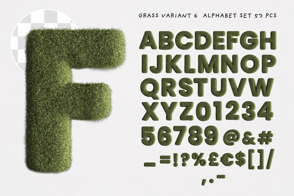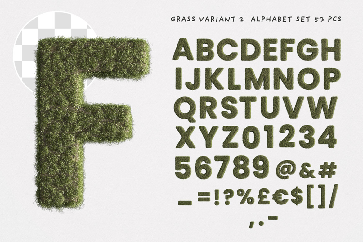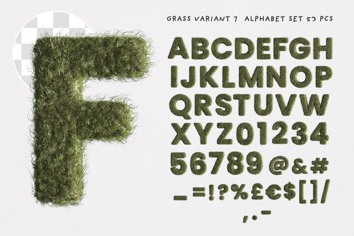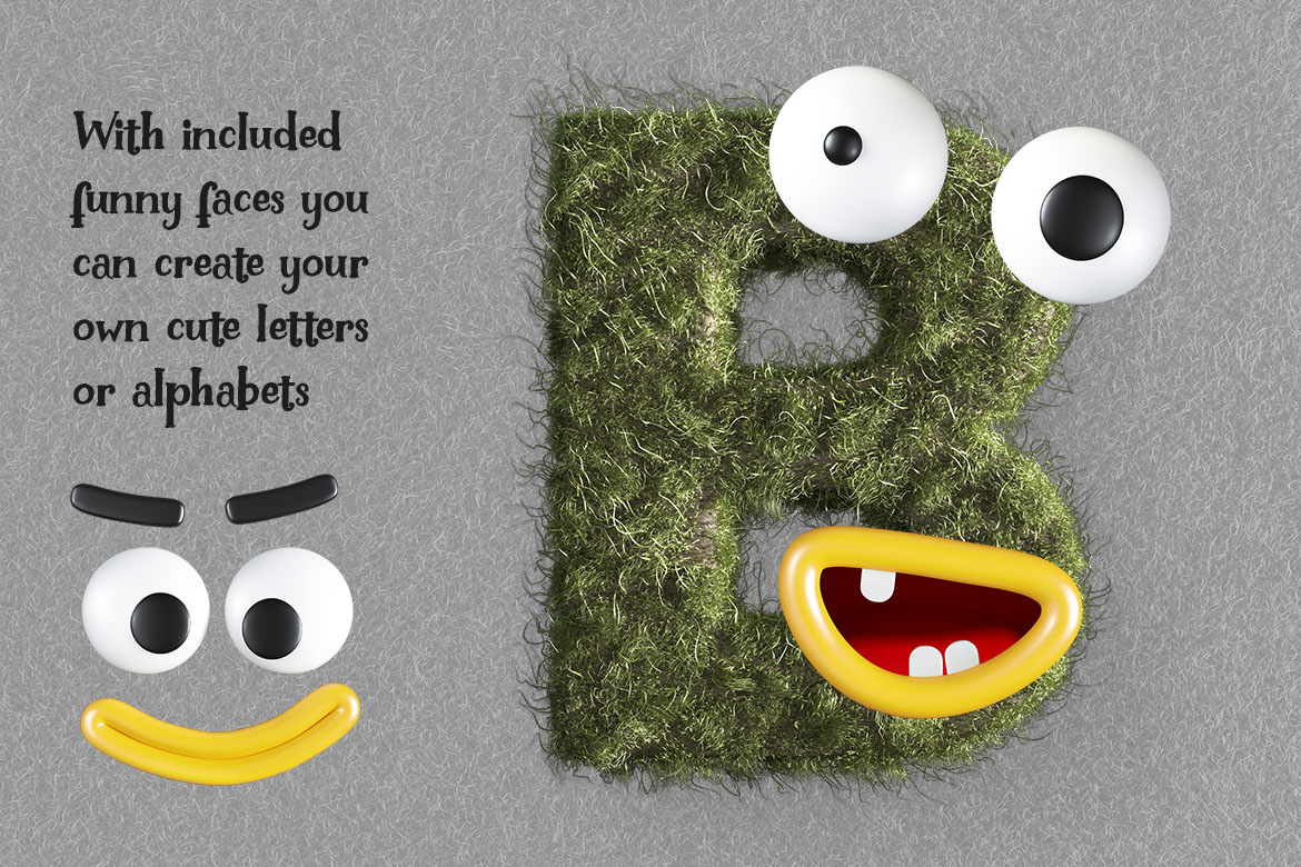 - BONUS graphics: funny PNG faces you can place on any letter and create own alphabets, 2 grass brushes, 8 grass textures or backgrounds