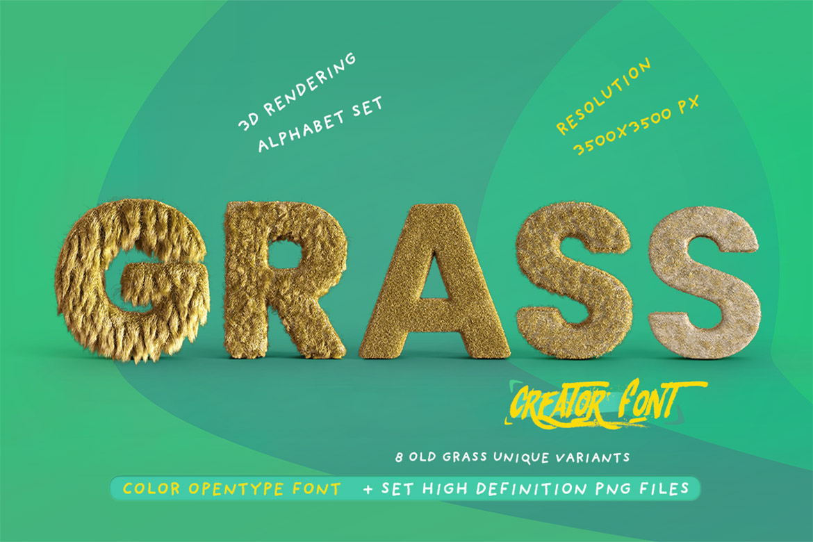 Super creative, cute, playful & funny graphic PNG alphabets & 8 color SVG fonts (old dry grass or fur). If you need to create original & happy artwork for your kids or realistic grass header in minutes you need to check this bundle! All these PNG graphics are hi-res so really great for any print or web projects. Color SVG fonts are better for smaller resolution projects. Great for original print design, banner, social media post or any graphic promotion 😉 Please check all preview images.