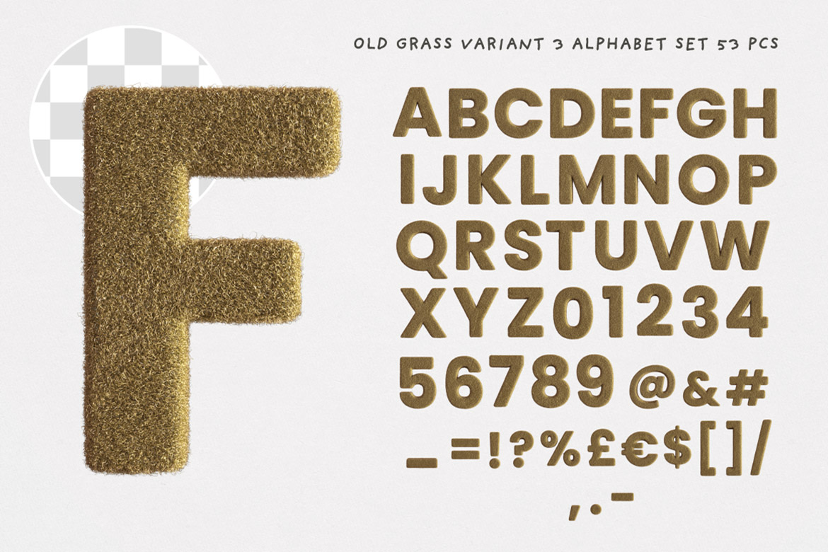 - 24 grass or fur in clay, green & old dry color – hi-res transparent PNG alphabets (3500 x 3500 pix)