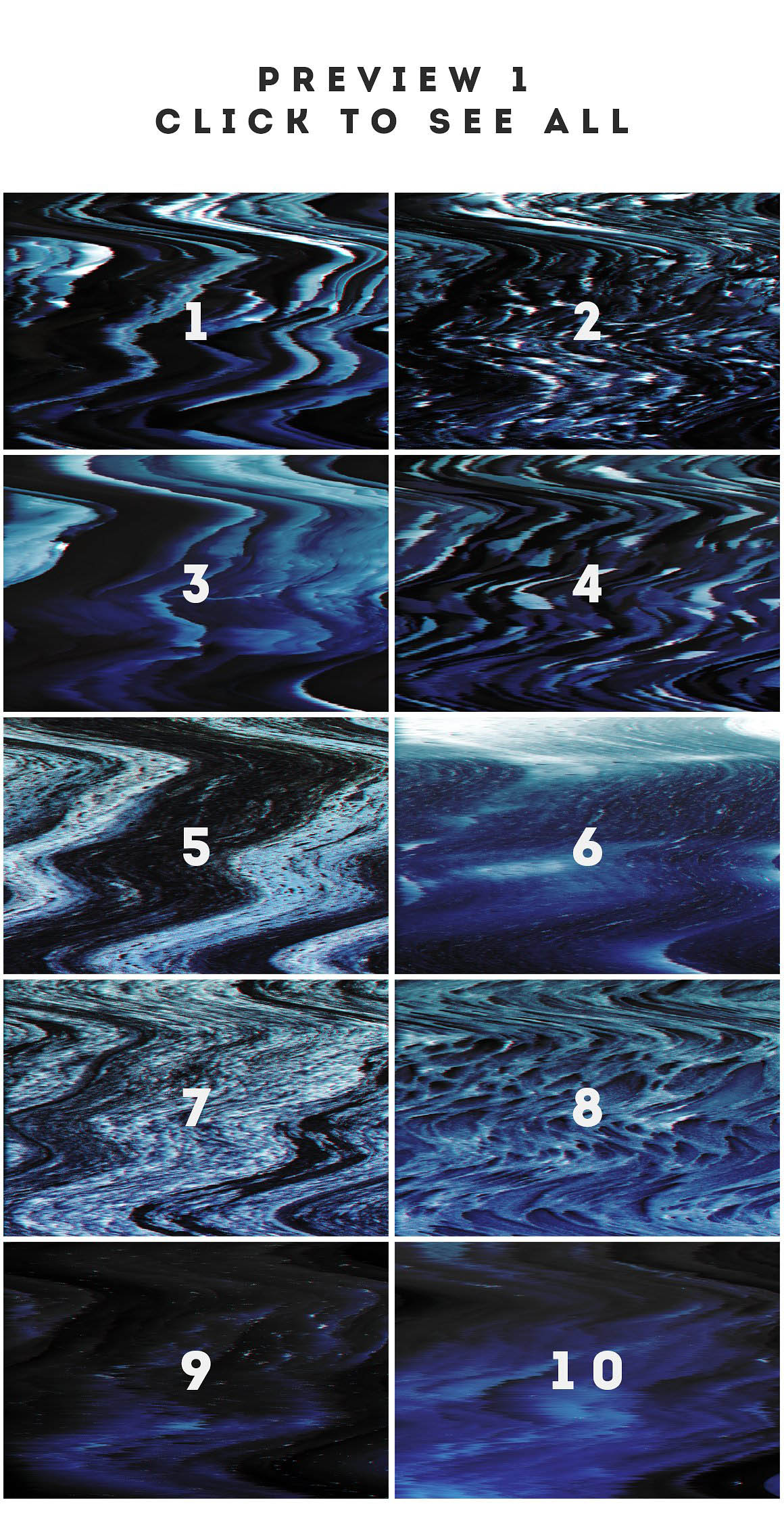 ► A set of 20 abstract glitch textures in blue tones, created digitally. They can be used as backgrounds and their high resolution and size will ensure a good quality if you are using them for a project that will be printed.
