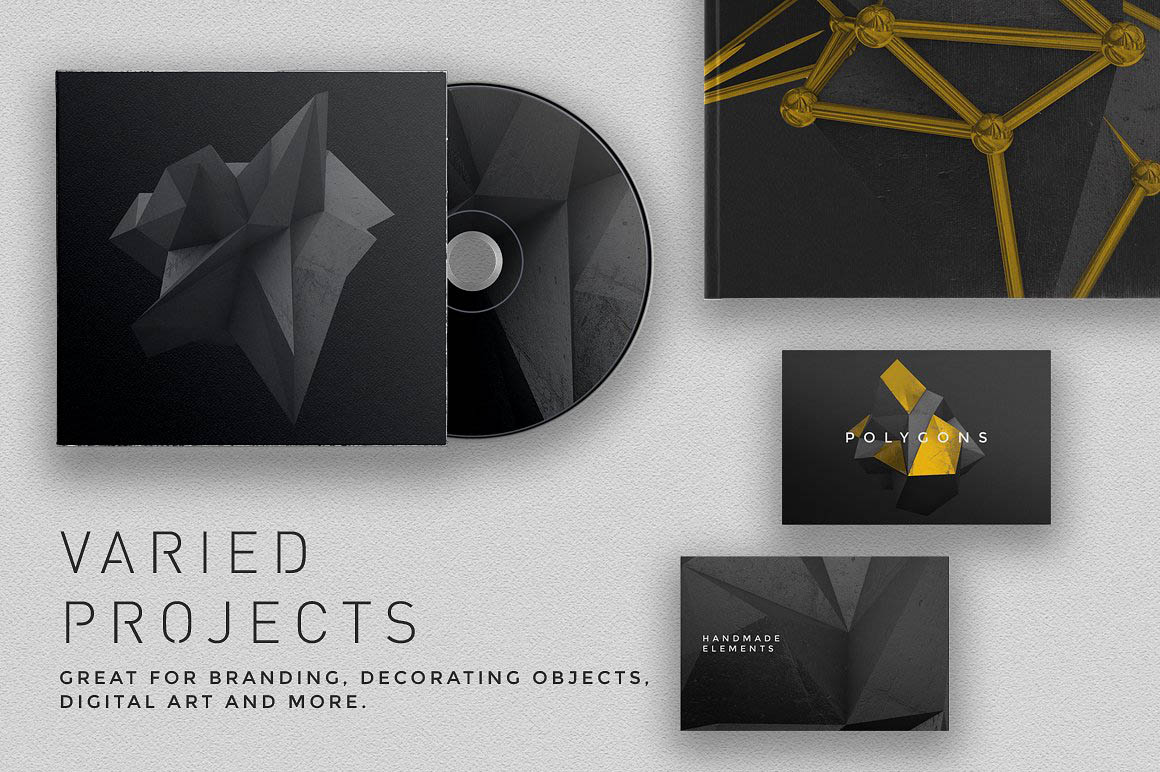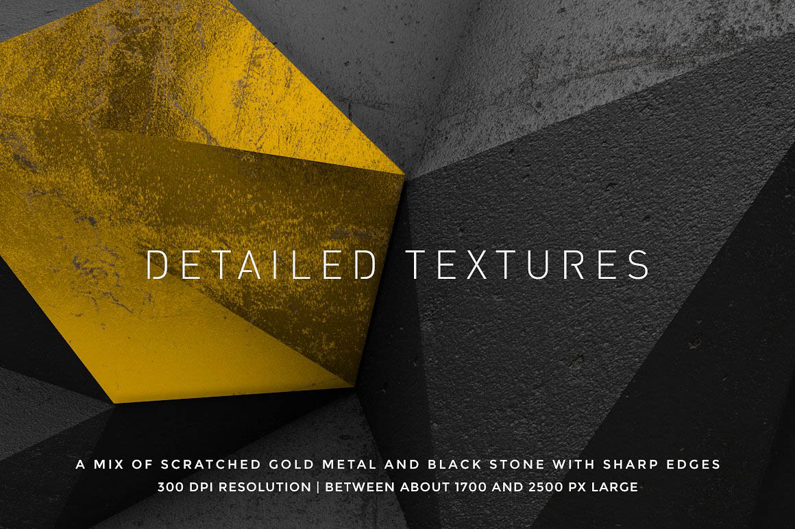 There’s also a set of 10 polygonal shapes that you can combine with the textures and with some text if you want. The shapes are provided as AI, EPS and PNG formats. The PNG files are around 4000px large, with transparent background and 300 DPI resolution.