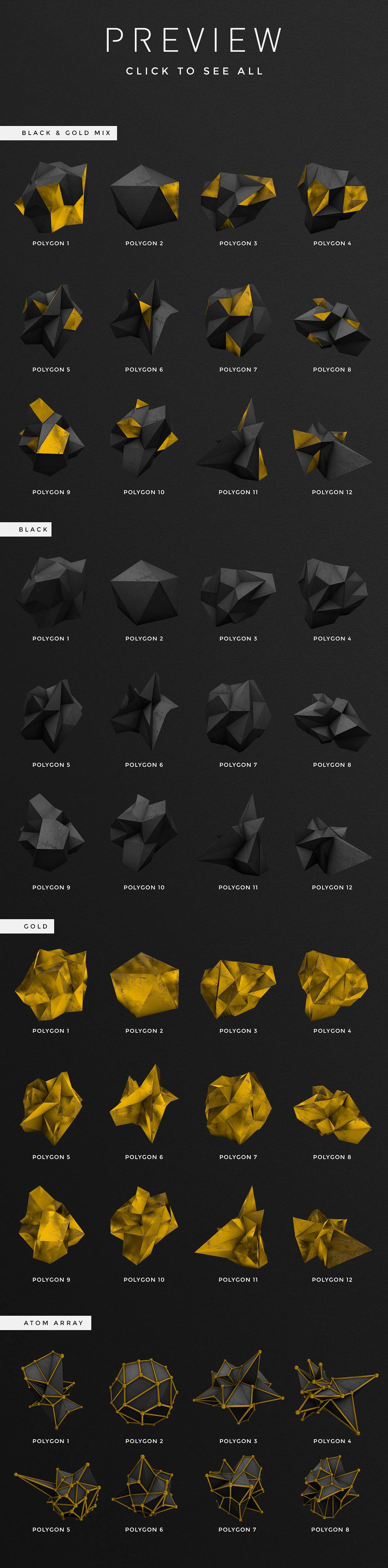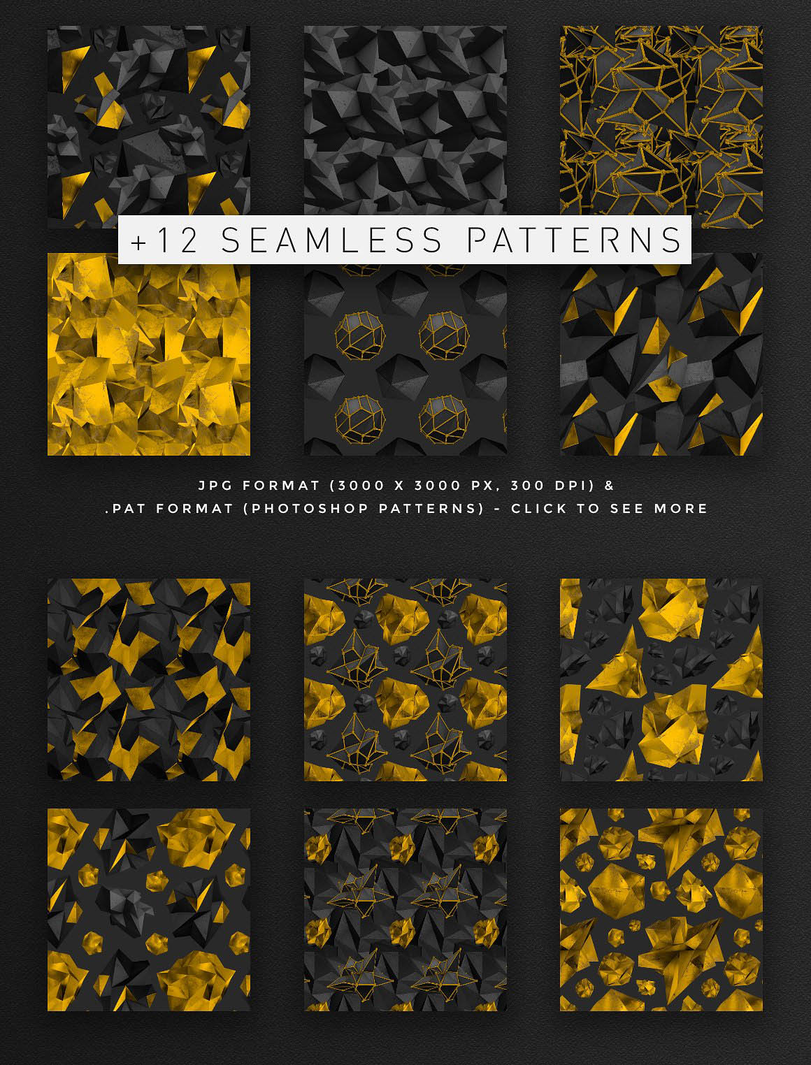 These polygonal shapes will add a nice modern geometric touch to your projects 🙂 This set includes a total of 36 elements made from 3D renders, each available in 3 versions: black & gold mix, black, and gold. There are also 8 “atom array” polygons included. These are black with a metallic gold structure around them. All these polygons are provided as individual 300 dpi files, and are between about 1700 and 2500 px large. Choose between transparent png files, or layered psd files (where there’s a shadow layer that you can edit, if for example you’re creating a design where the polygon is sitting on the floor and therefore casts a shadow). This set also includes 12 seamless (tileable) patterns, available both in jpg and .pat (Photoshop patterns) formats. The jpg files are 3000×3000 px large with a resolution of 300 dpi.