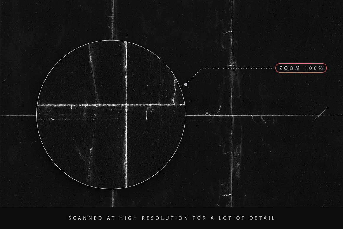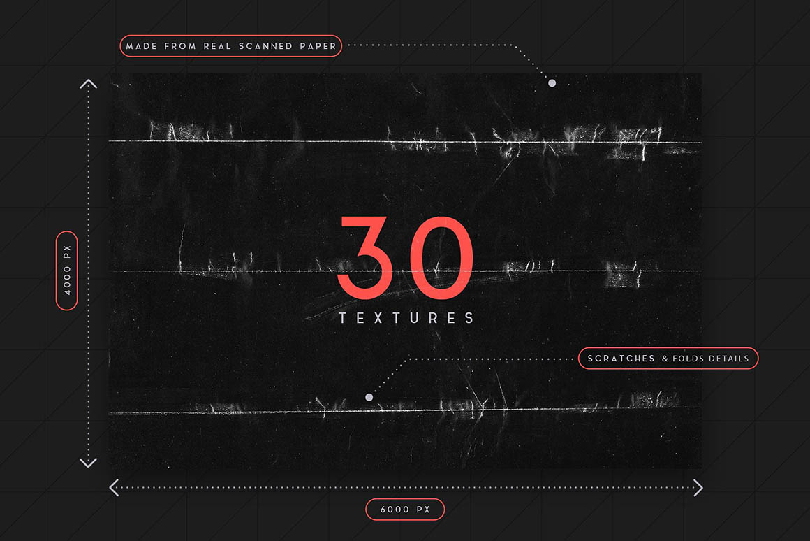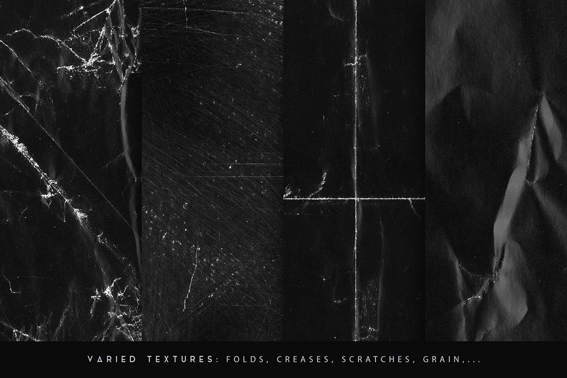 Quickly give your designs a grunge paper look with this set of 30 textures! With a size of 6000 x 4000 px and a resolution of 300 dpi, they can be used in many different projects. They were made using black paper sheets that have been carefully folded, crumpled or scratched for unique grunge looks, and then scanned at high resolution to retain as many details as possible. Black paper textures work great when set to the blending mode Screen, or Lighten. They will create a “worn out printed poster” effect – adjust levels and opacity for custom results. If you invert them, you can also use them as layer masks.