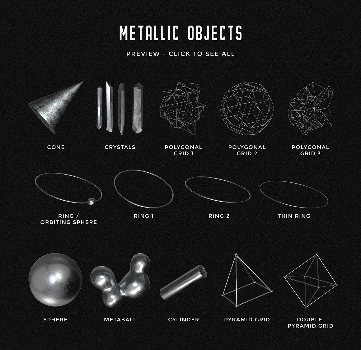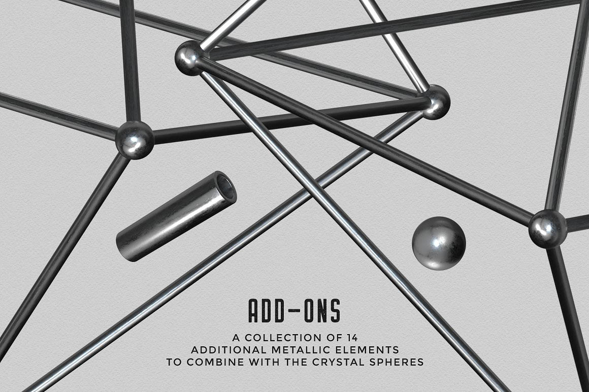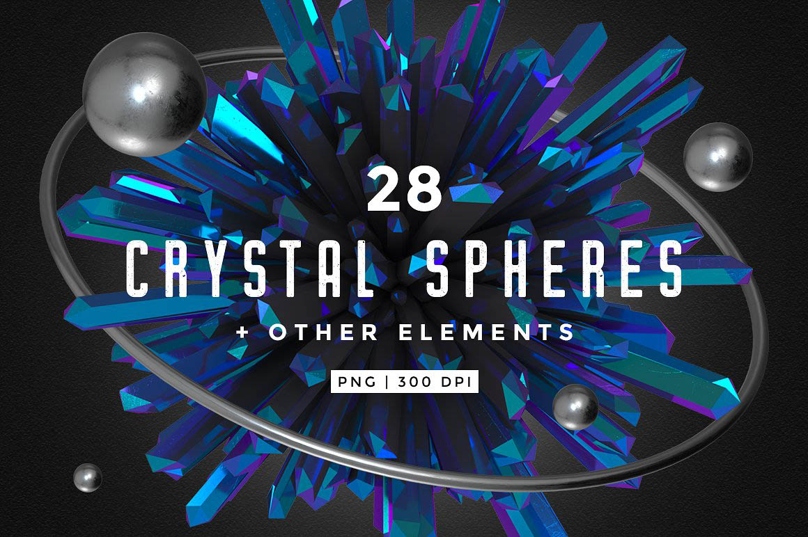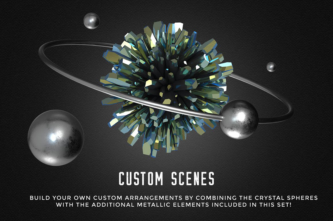 This design kit includes a collection of 28 crystal sphere elements for your design projects! Inspired by titanium quartz crystals, these abstract spheres feature bright metallic colors and a sharp low poly look. You can choose between “regular” crystal sphere (16 elements), and randomized crystal spheres (12 elements). Each sphere is around 3000 px large. There’s also a set of 14 various silver/metallic elements such as a sphere, rings, polygonal grids, etc, that you can combine with the crystal spheres for unique and custom designs. You can also use one of the 5 premade scenes provided with this kit, if you prefer. Each premade scene is a fully layered PSD file (3000 x 3000 px, 300 dpi), where you can move the elements around, change the background color, or add your own text if you want.