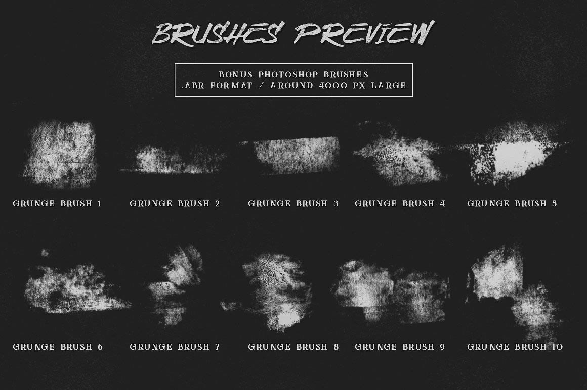 Grunge brushes are a nice way to add texture to digital designs, whether it is an illustration or a typography composition! This set features 62 Photoshop stamp brushes, including varied textures as well as rolled ink border brushes. All these brushes are available in two different sizes; a very large size version (around 5000 px, for Photoshop CS6+), and a smaller size (around 1000 px, for older Photoshop versions or smaller canvases). If you don’t have Photoshop or prefer working with textures, no problem! I’ve included each brush from the set as high-res PNG files as well.